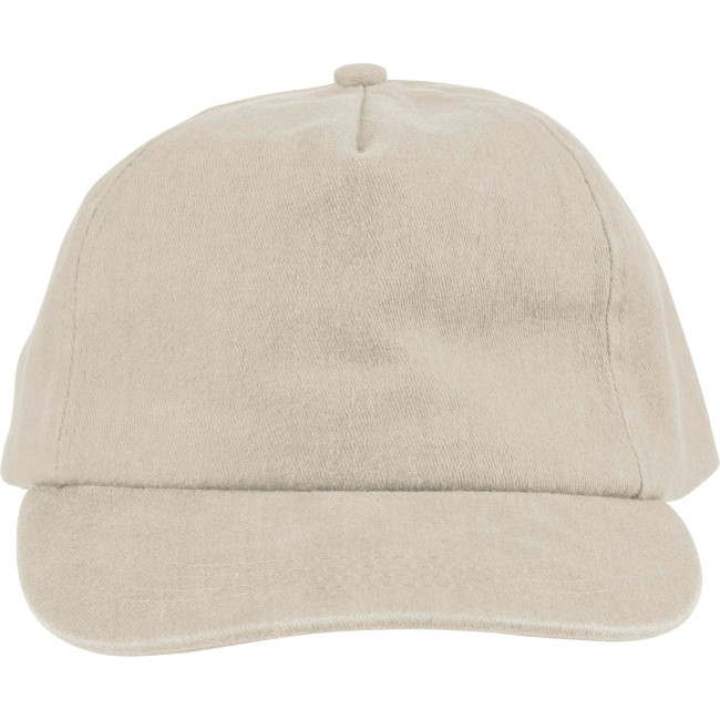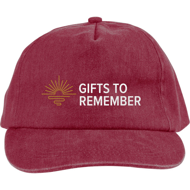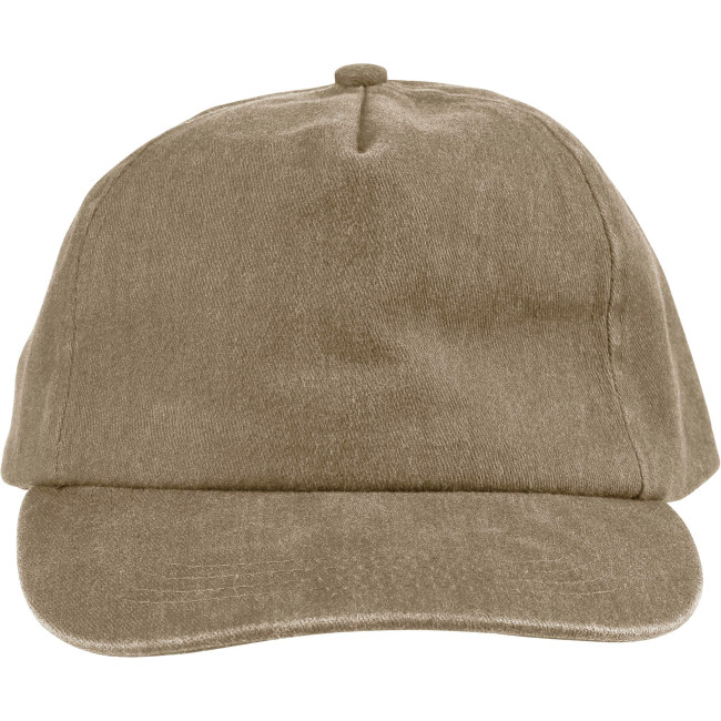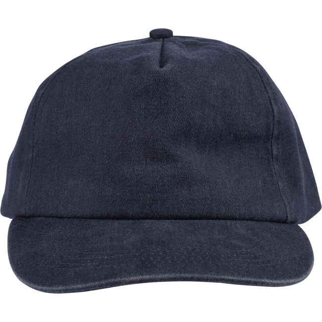Cappellino in cotone 240 g/m2, finitura lavata, con design a 5 pannelli e visiera da 7 cm. Vestibilità regolabile con chiusura a fibbia in ottone. Nessuna fodera interna.