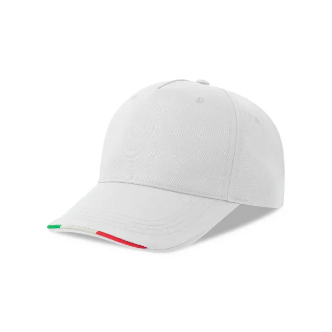 Cappello a 5 pannelli realizzato in 100% poliestere riciclato, caratterizzato da un profilo a contrasto nella visiera che richiama i colori della bandiera italiana. Questo accessorio combina sostenibilità e design, rendendolo una scelta ideale per chi cerca un prodotto responsabile e alla moda.