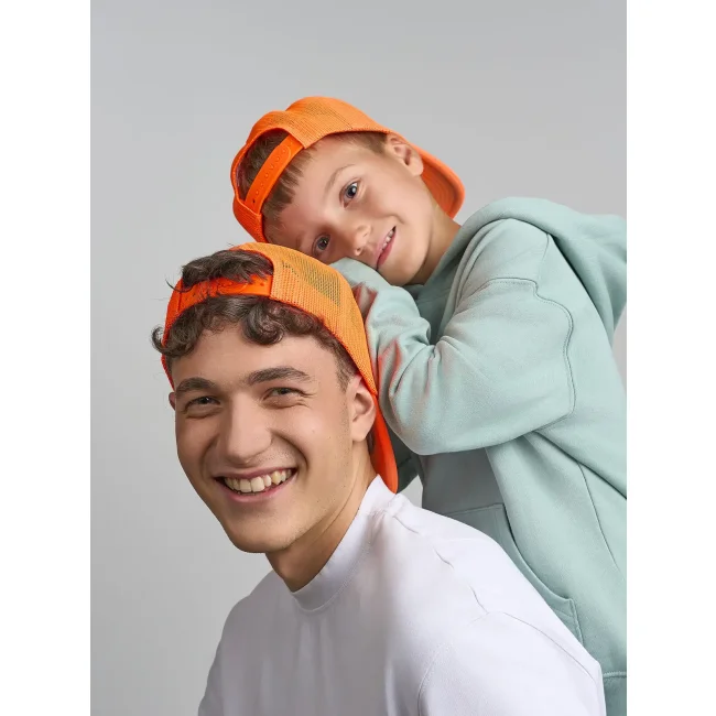 Cappello Kid rapper-S progettato per bambini, realizzato in 100% poliestere riciclato. Presenta un design a 5 pannelli con pannello frontale imbottito, mesh laterale e posteriore, e chiusura snap-back. Un accessorio pratico e sostenibile per i più piccoli.