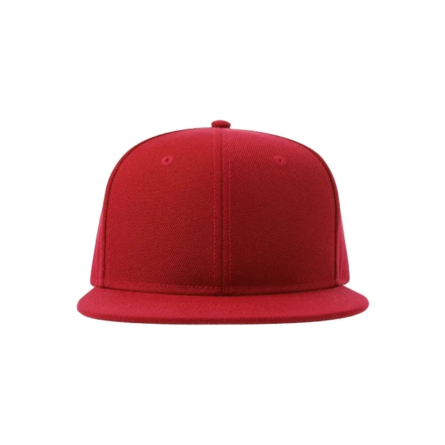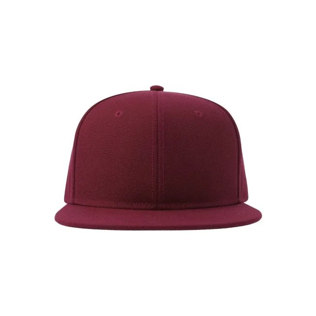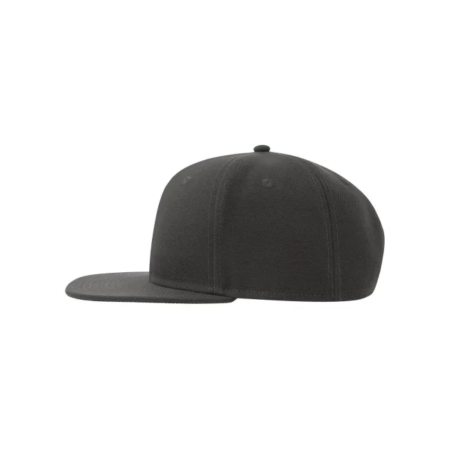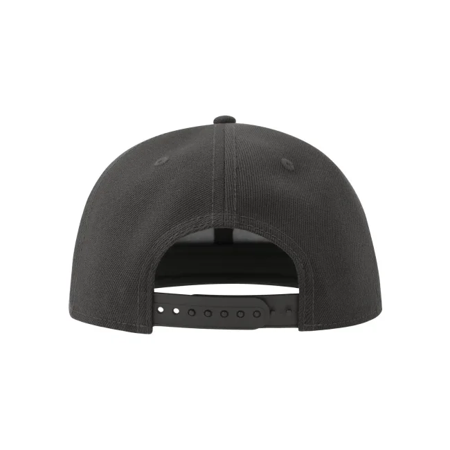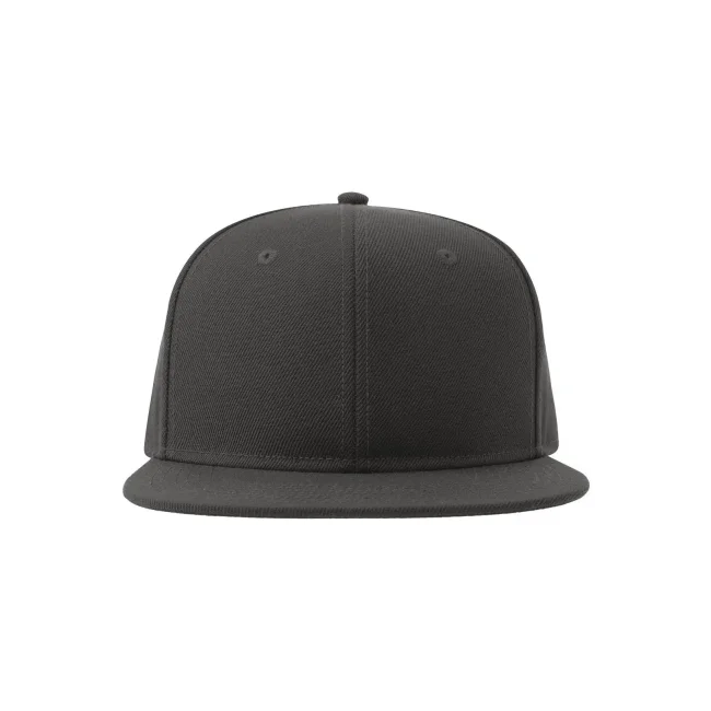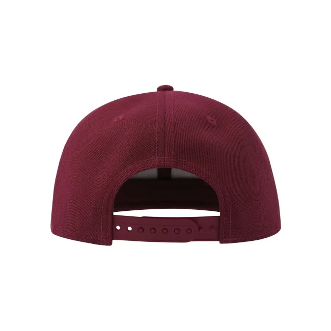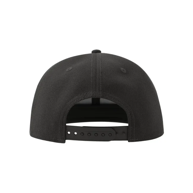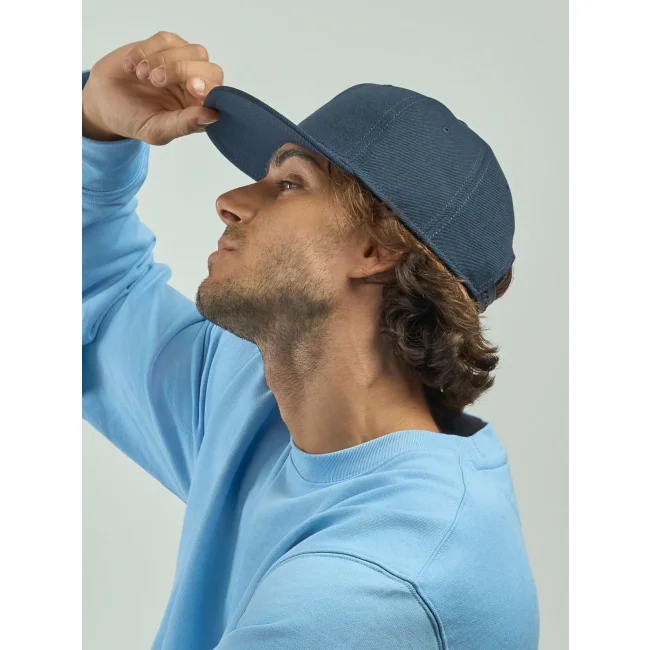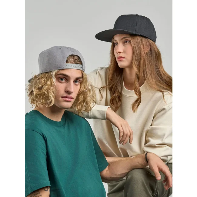 Cappello Snap Back-S realizzato in poliestere twill riciclato al 100%, presenta una struttura a sei pannelli con occhielli ricamati e una visiera piatta. La chiusura con cinturino in PVC e l'etichetta removibile offrono comfort e praticità.