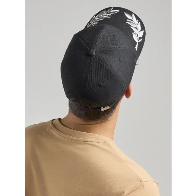 Cappello a 6 pannelli realizzato in twill di poliestere riciclato, con una foglia di alloro ricamata sulla visiera. Presenta pannelli frontali strutturati e una chiusura con fibbia di metallo, per un look elegante e sostenibile.