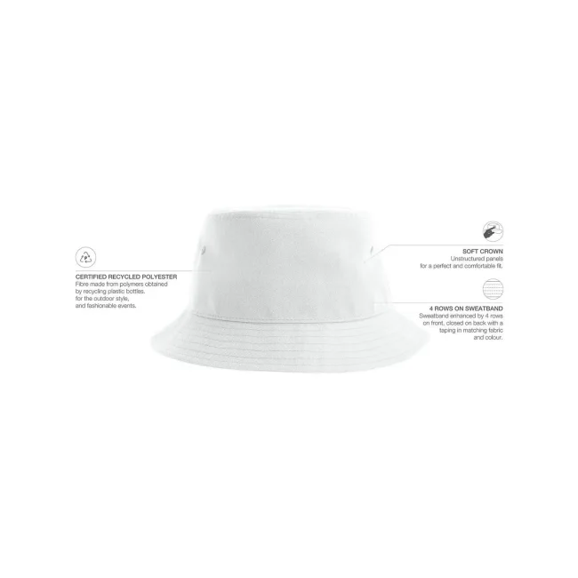 Cappello Geo in poliestere riciclato certificato, progettato come modello pescatore. Presenta occhielli ricamati e un parasudore in poliestere, con una circonferenza di 58,5 cm. Etichetta removibile per un utilizzo pratico e versatile.