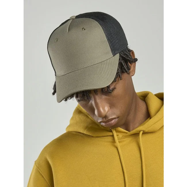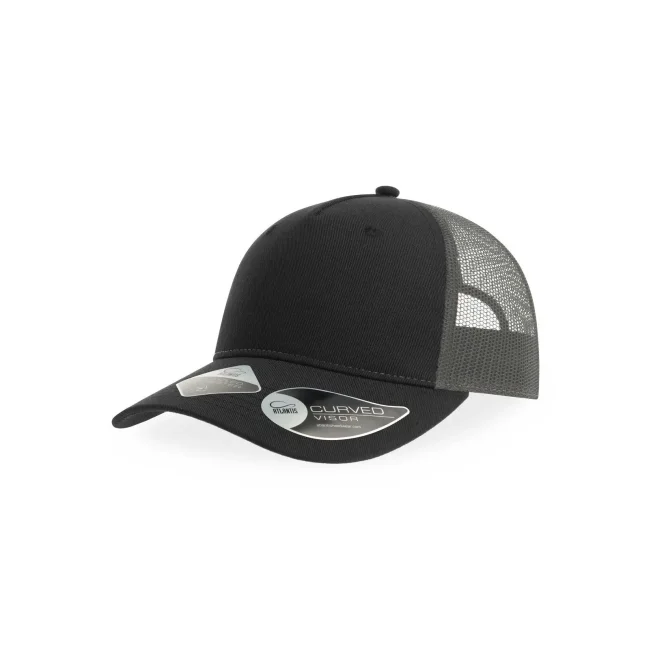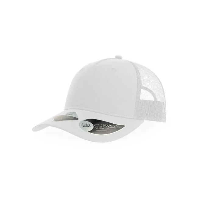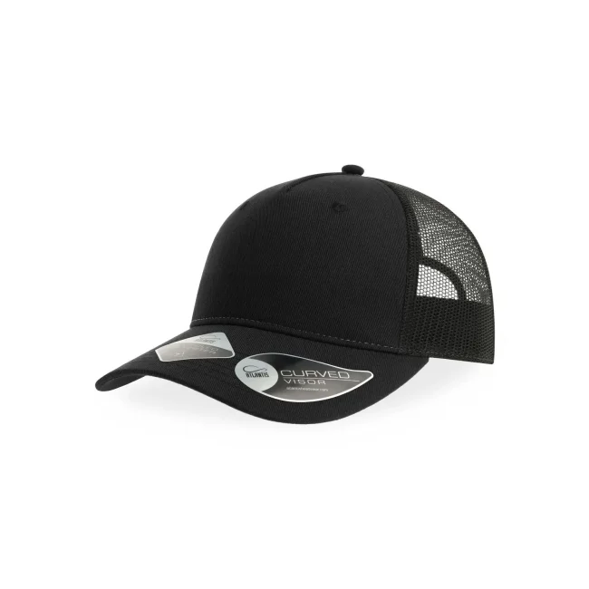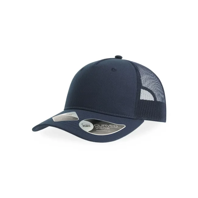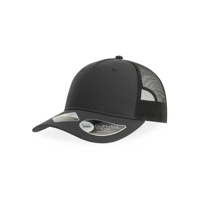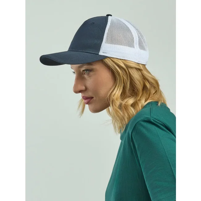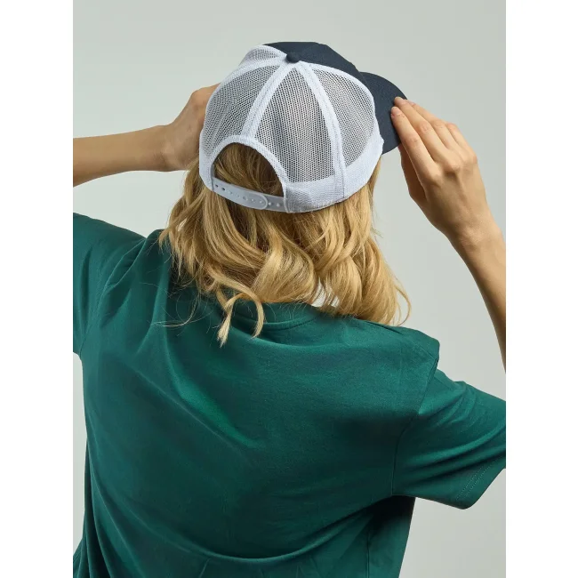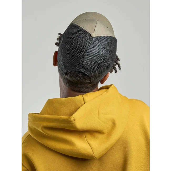 Cappello trucker strutturato a 5 pannelli, realizzato in poliestere twill riciclato certificato. Dotato di mesh per una migliore ventilazione e chiusura snapback per una vestibilità regolabile. L'etichetta removibile consente personalizzazioni senza compromettere il design.
