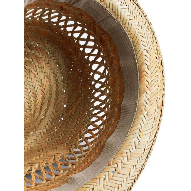 Cappello intrecciato a mano realizzato in 100% paglia naturale, progettato per un look estivo fresco. Disponibile in due misure, S/M e L/XL, con etichetta adesiva in tessuto facilmente rimovibile, rendendolo ideale per branding e personalizzazione.