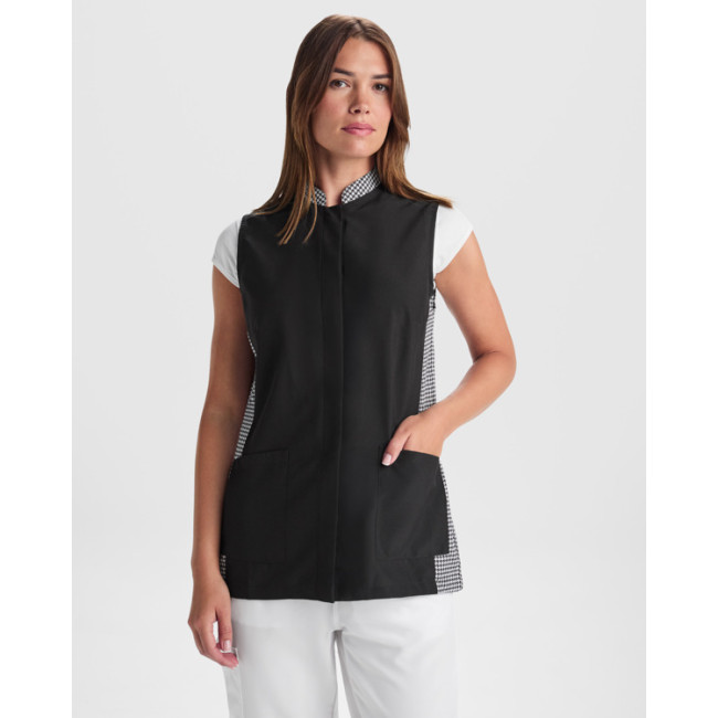Cappotto senza maniche da donna, caratterizzato da chiusura centrale con bottoni a pressione nascosti e collo Mao. Include cuciture laterali e pinces sul petto, oltre a due tasche frontali applicate. Personalizzabile per esigenze aziendali, è una scelta elegante e funzionale per il lavoro.