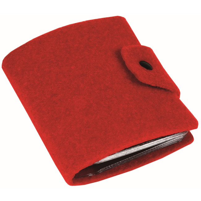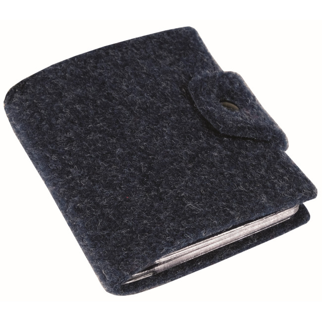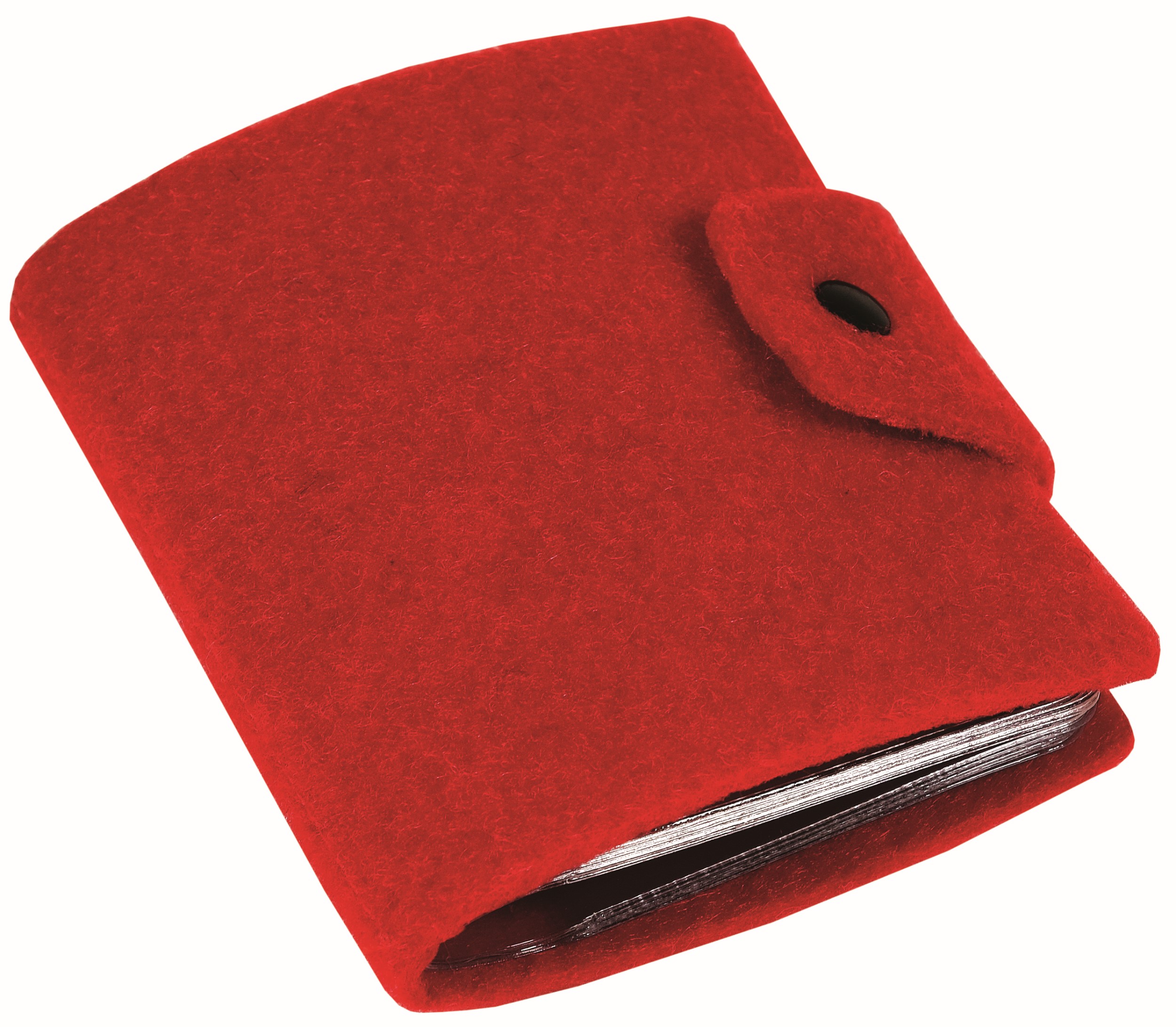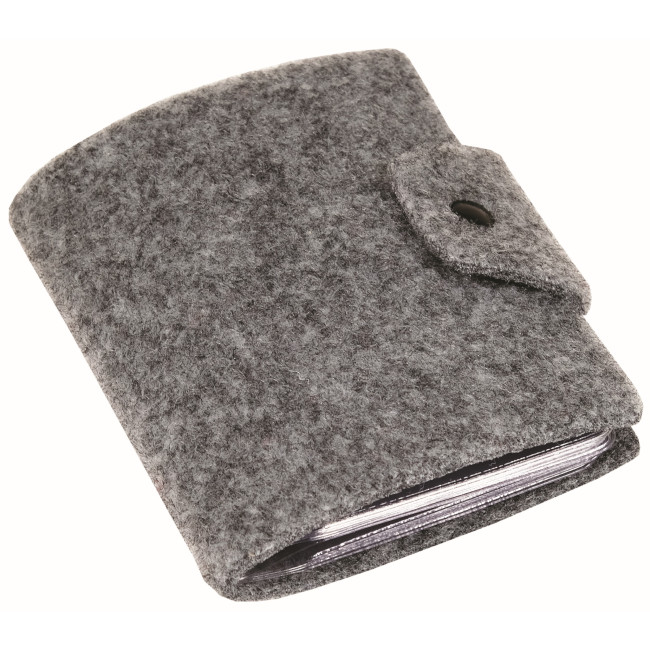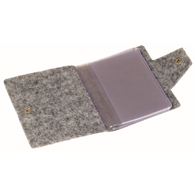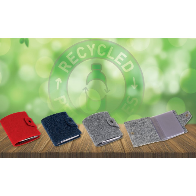 Porta carte di credito con otto taschine portacarte. Esterno in feltro riciclato (Recycled PET Felt) da 620 g/mq, chiusura con bottone.