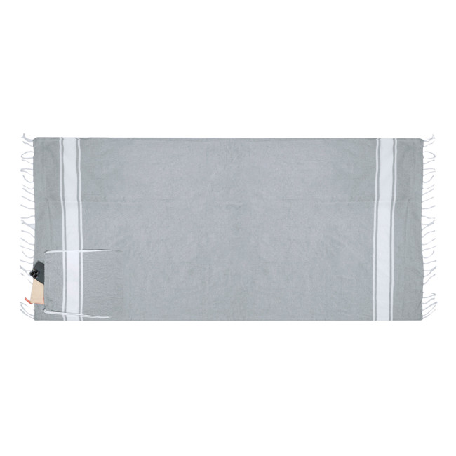 Zaino pareo 180x90 cm in resistente cotone riciclato 170 g/mq in vari colori. Con speciale piegatura che lo trasforma in una sacca per un comodo trasporto. Con logo cotone riciclato sull'etichetta esterna. Presentato in borsa individuale.