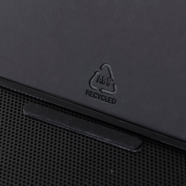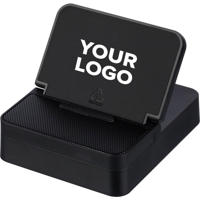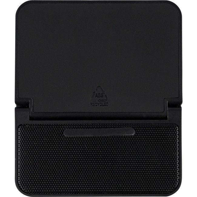 Caricatore wireless 3-in-1 in ABS riciclato, include speaker e supporto per smartphone con design a forma di cubo, dotato di ricarica wireless rapida da 15 W, funzione altoparlante da 5 W e tecnologia di connessione wireless versione 5.4, con batteria da 1200 mAh, griglia frontale in metallo e dettaglio in PU riciclato sulla parte superiore, ingresso 5V/500 mA, presenta logo materiale "riciclato", confezionata singolarmente in una scatola in cartone avana.