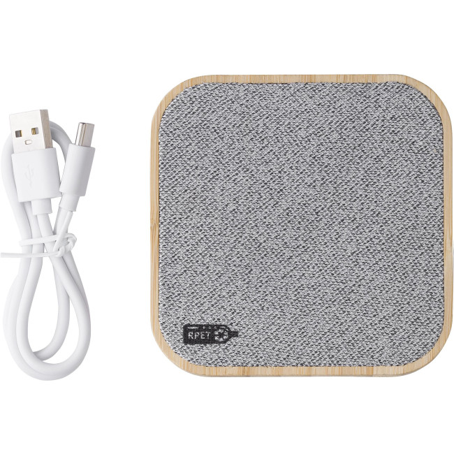 Caricabatterie wireless in bambù con dettagli RPE, ricarica rapida 15 W, confezionato singolarmente in una scatola in cartone avana