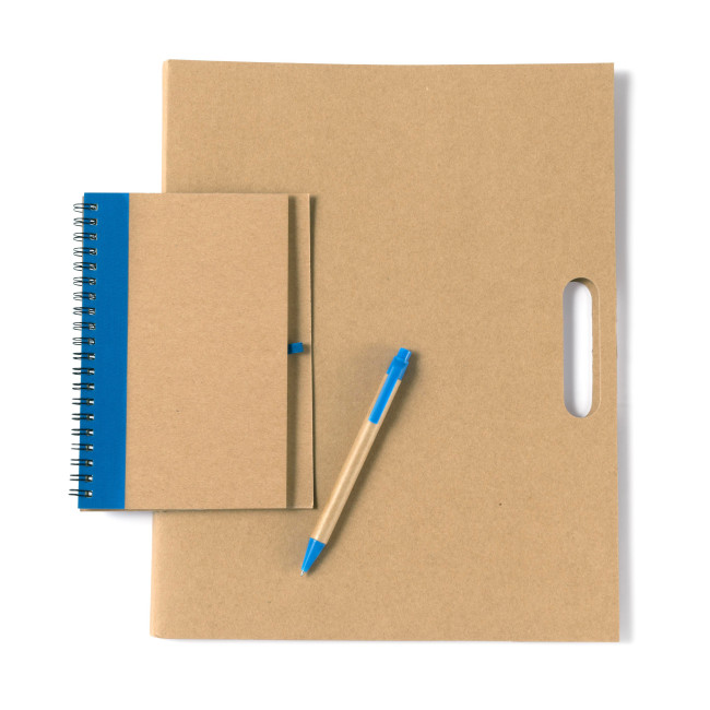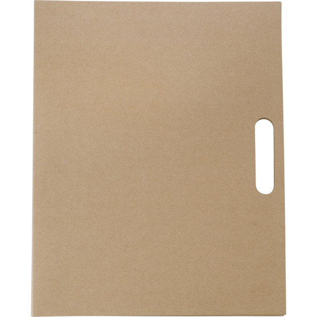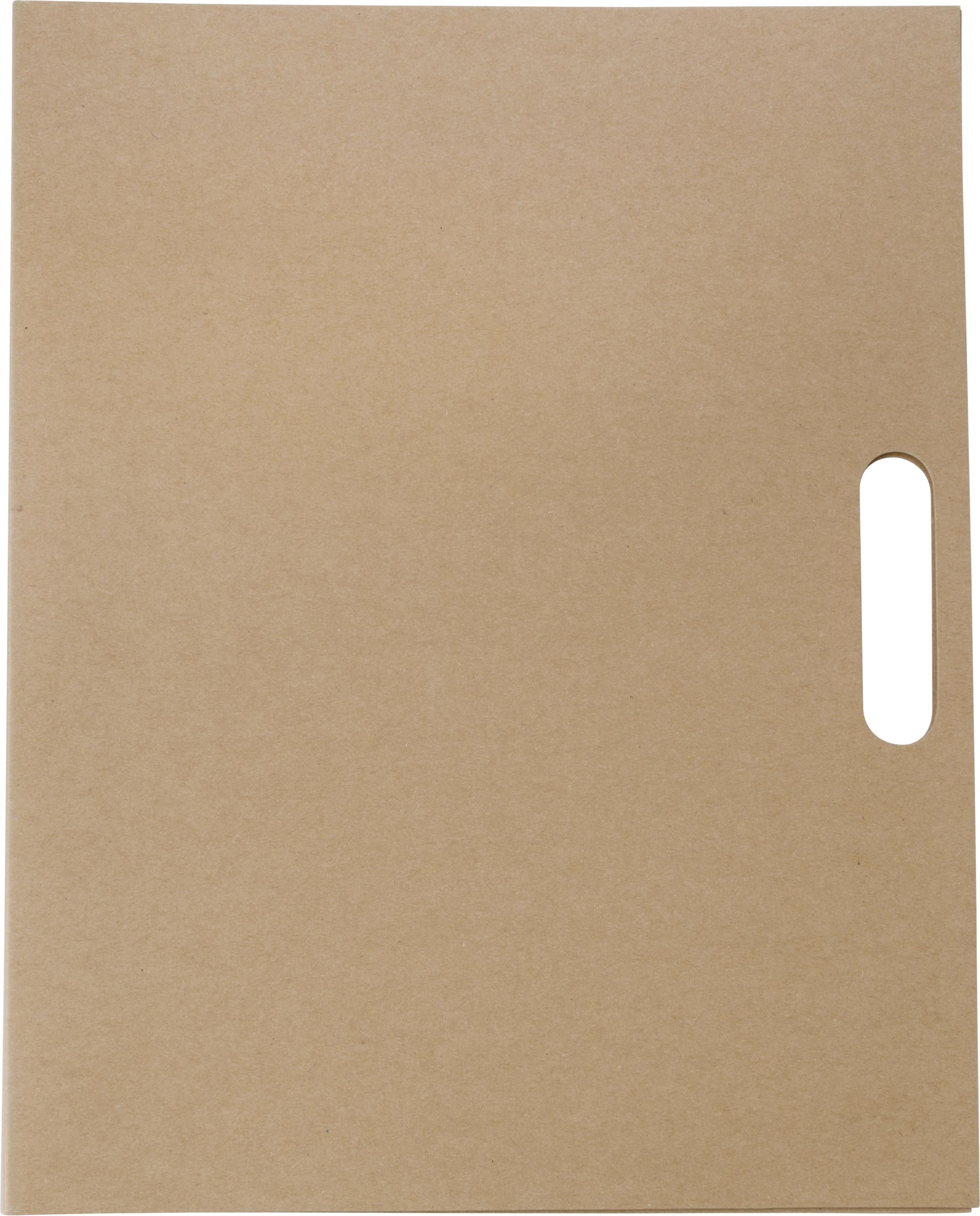 Cartella portadocumenti in cartone, include 150 memo stick in vari colori, block-notes a righe da 25 pagine, penna a sfera con corpo e clip in cartone, refill blu