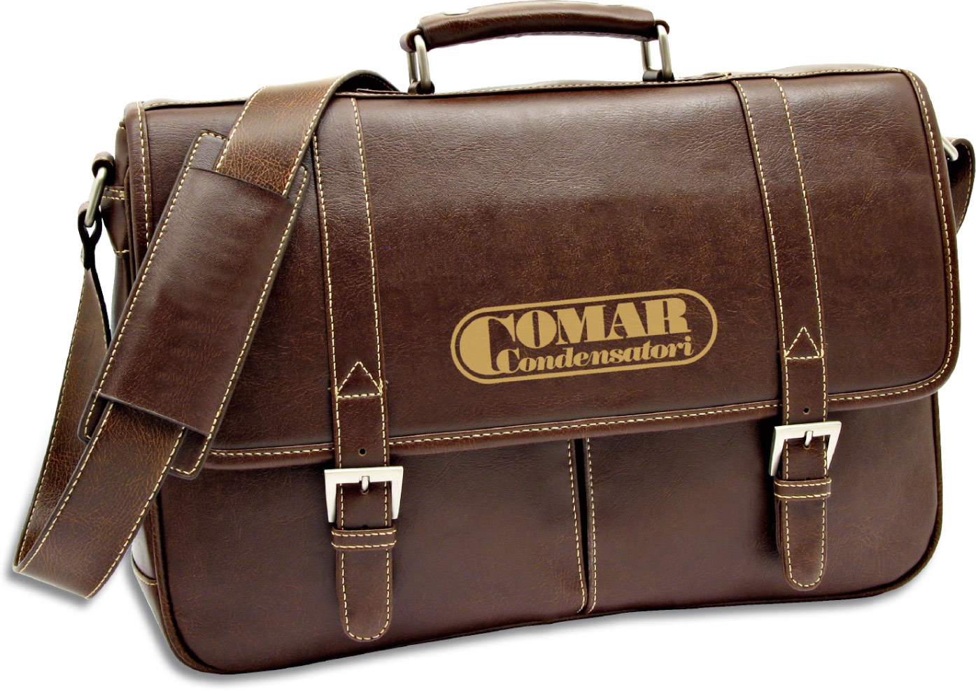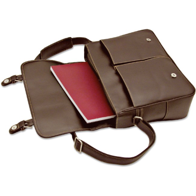 Cartella portadocumenti "RKS" in morbido materiale di colore marrone scuro, tracolla e proteggi spalla, manico, 2 comode tasche frontali, tasca posteriore, 2 vani interni portaoggetti. Confezione in polybag.