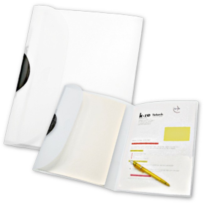Cartellina a 3 ante, in polipropilene trasparente, con ferma fogli laterale e tasca interna. Confezione in polybag.