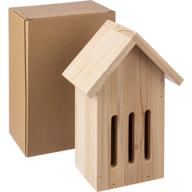 Casetta per farfalle in legno di pino, tre aperture sul lato anteriore, gancio in metallo sul retro per il montaggio, confezionata singolarmente in una scatola in cartone avana