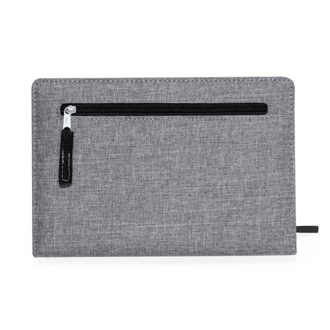 Taccuino in RPET 300D. Con copertine rigide e tasca nella copertina posteriore con chiusura a zip. Include 100 fogli con layout a righe singole, chiusura elastica e portapenne laterale. In grigio, con eleganti dettagli neri. Logo RPET sulla copertina posteriore.Il materiale RPET è realizzato in plastica riciclata, promuovendo così il riutilizzo dei rifiuti di plastica e contribuendo alla sostenibilità del pianeta.