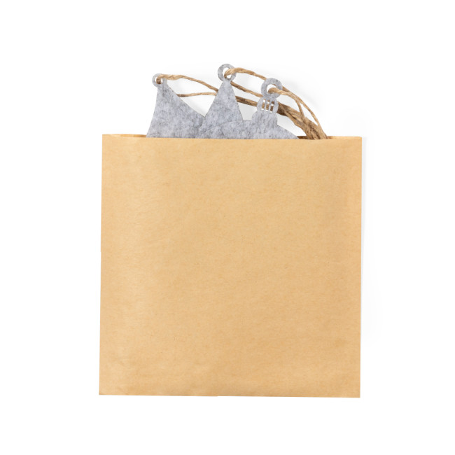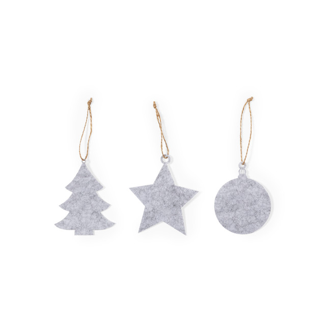 Set di 3 decorazioni natalizie in morbido feltro. Include 3 modelli: albero di Natale, stella di Natale e palla di Natale. Tutti i pezzi includono una gancio per appenderli. Presentato in un sacchetto di carta riciclata.