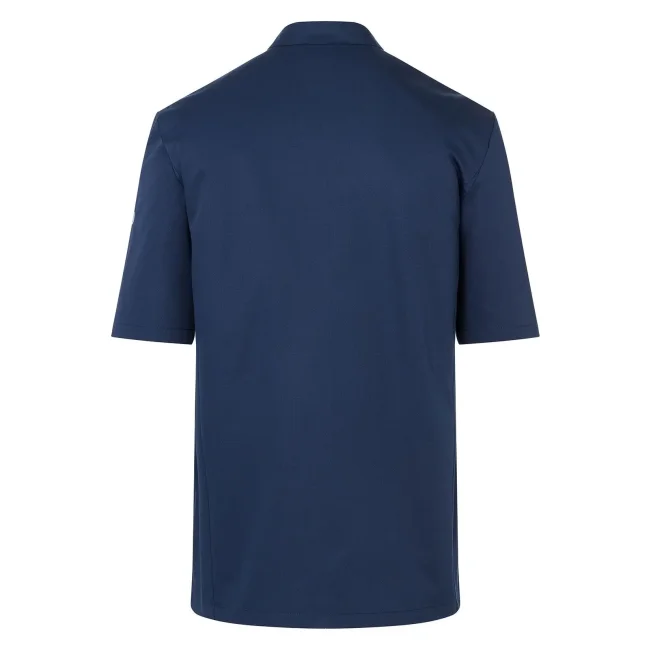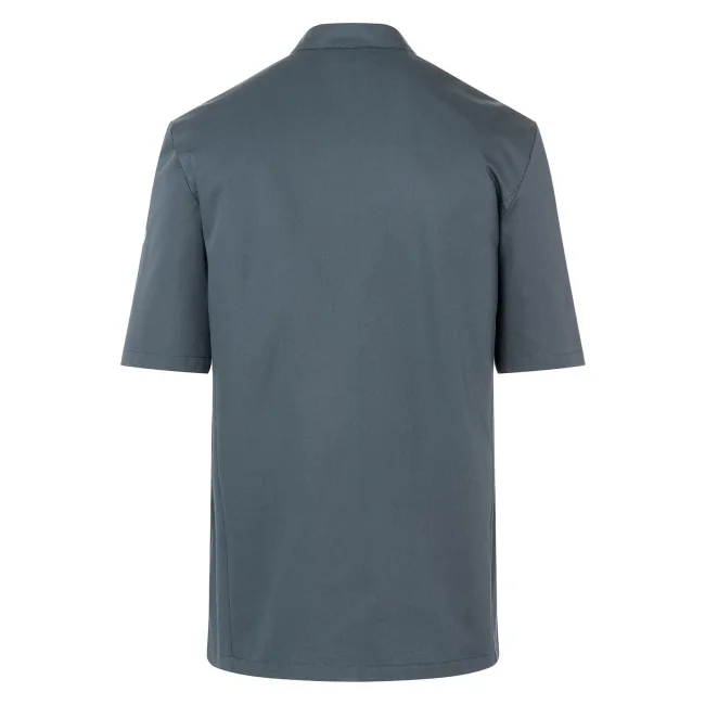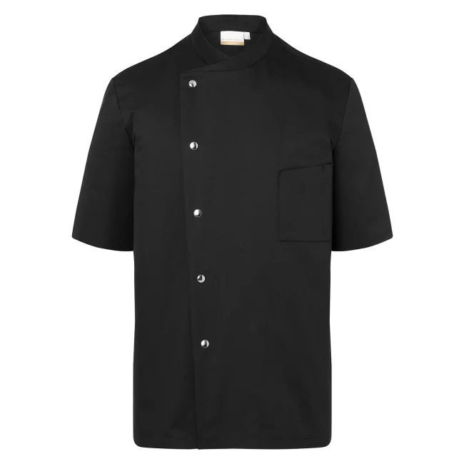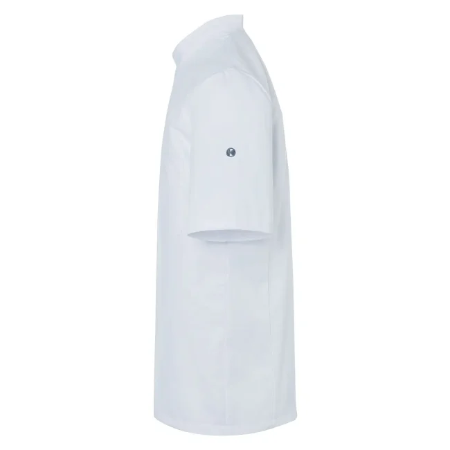 65% poliestere, 35% cotone preristretto. Giacca da chef in tessuto di alta qualità, 5 bottoni a pressione disposti in un'unica fila, taschino al petto con compartimento per penna, maniche corte, cuciture Vienna nella parte posteriore. Adatta al lavaggio industriale, Lavabile fino a 95° C.