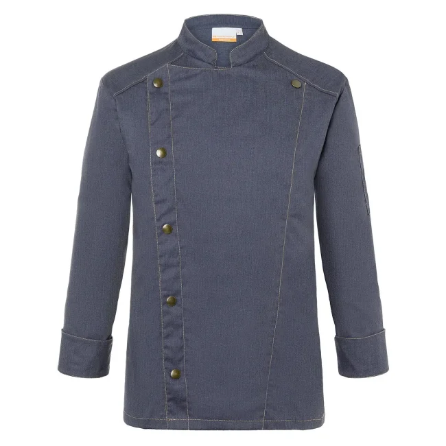 65% poliestere, 35% cotone. Giacca da cuoco di tendenza in stile jeans, tessuto rifinito, irrestringibile, lavabile, indumento pratico, dalla silhouette slanciata, impunture con filato in contrasto conferiscono un jeans look originale, chiusura asimmetrica dotata di un'unica fila di 5 bottoni a pressione per una rapida apertura e chiusura, polsini delle maniche con spacco laterale, tasca applicata sulla manica sinistra con pratico scomparto portapenne, adatto per lavaggi industriali. Lavaggio a 60°C.
