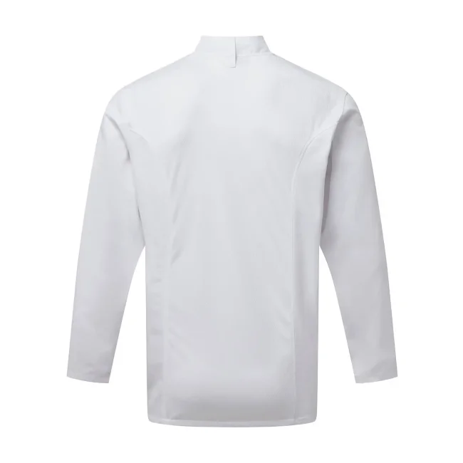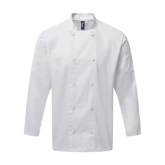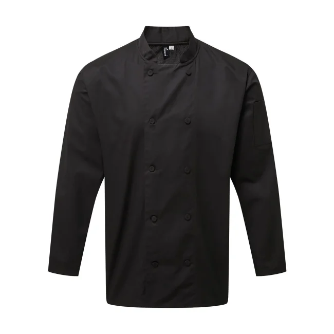 65% poliestere, 35% cotone twill. Giacca da chef a maniche lunghe. Dorso Coolchecker®, taschino doppio per penne, colletto alla coreana, chiusura con bottoni.