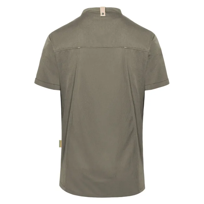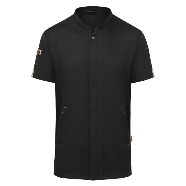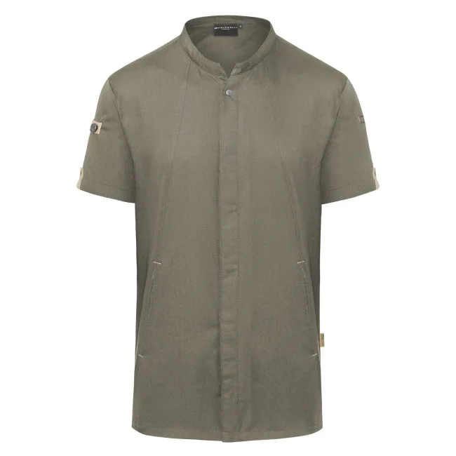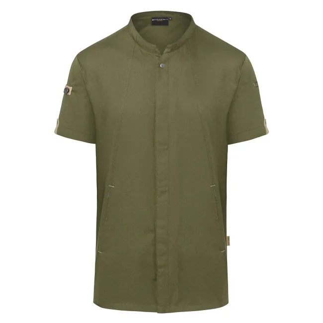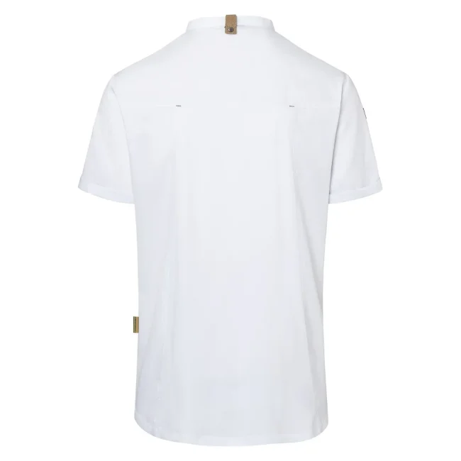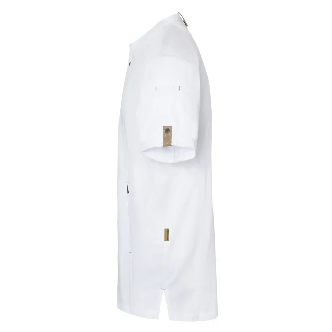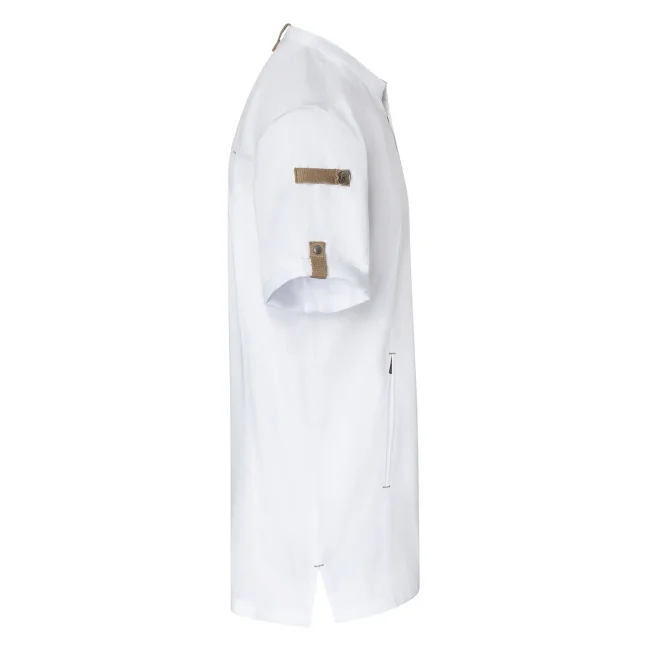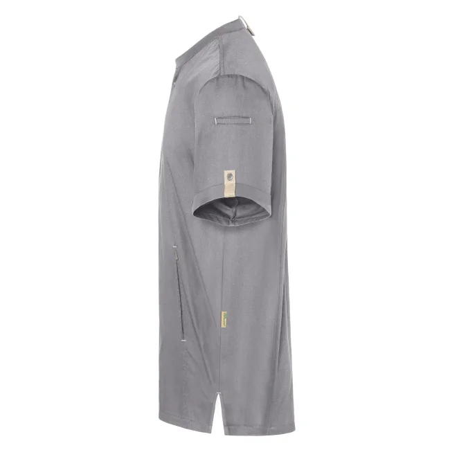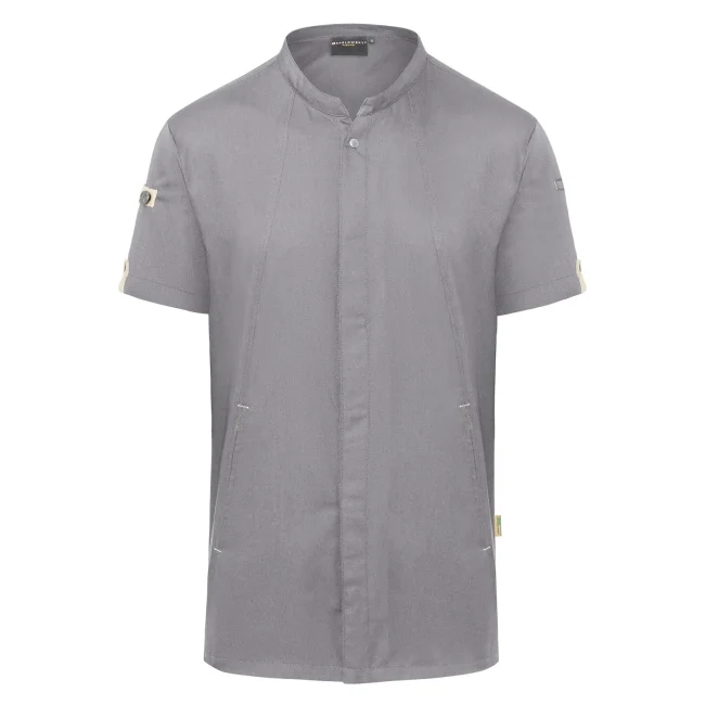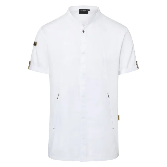 Lato anteriore: 65% cotone organico, 35% poliestere riciclato, Lato posteriore: 100% poliestere riciclato. Lato anteriore 150 g/m², Lato posteriore 150 g/m². Giacca da cuoco sostenibile, traspirante, con regolazione dell'umidità, maniche corte. Taglio moderno (leggermente aderente), inserto posteriore in Jersey Piqué per una maggior ventilazione e libertà di movimento, bottoni automatici, polsini con apertura. Lato anteriore con tasche con zip e tasca a filetto sulla manica sinistra, nastri a contrasto su maniche e collo. Lavabile a 60°C.