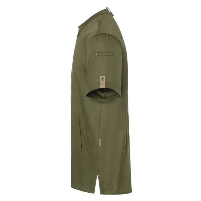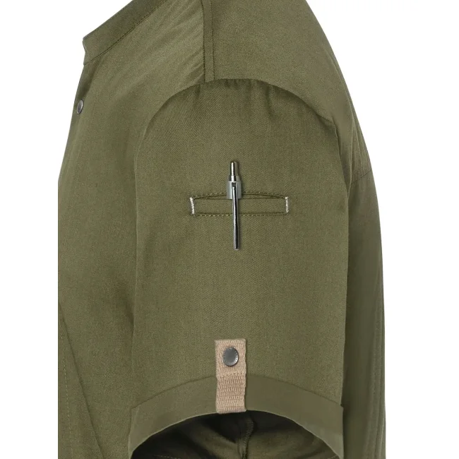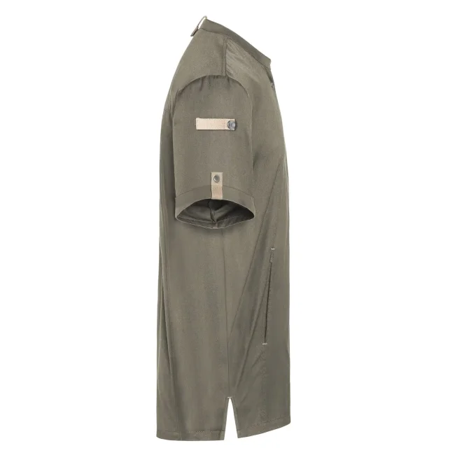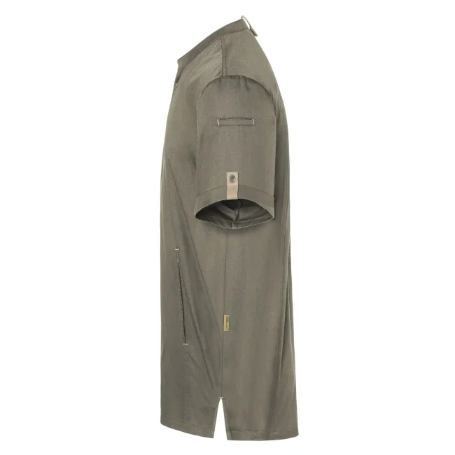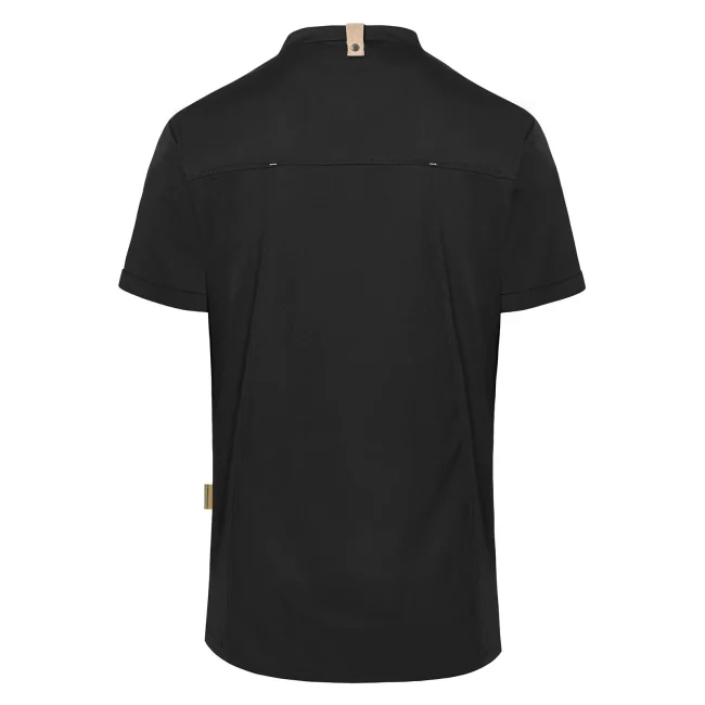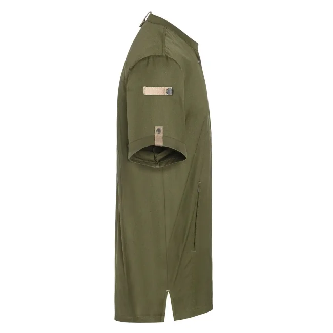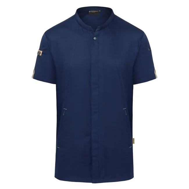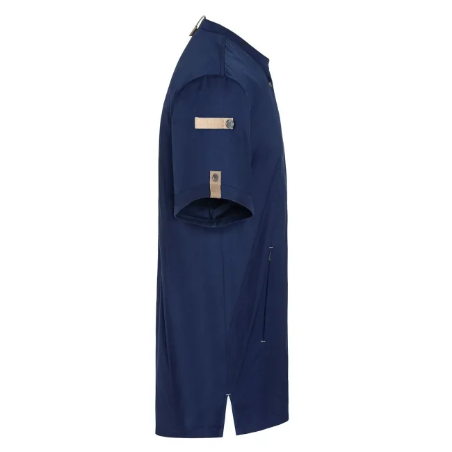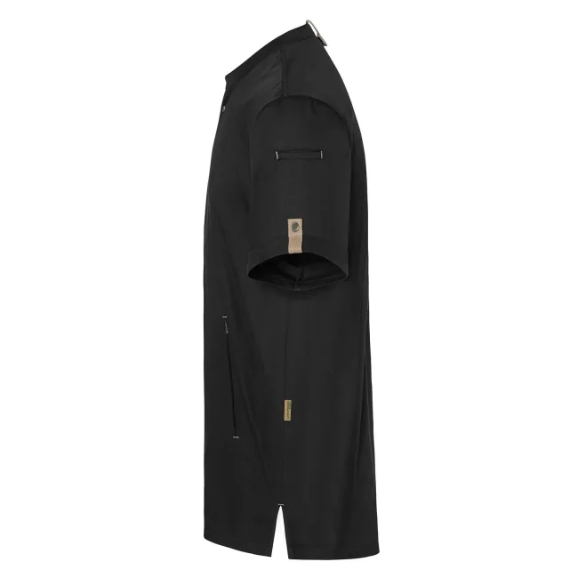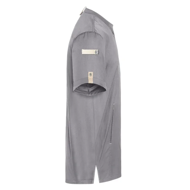 Lato anteriore: 65% cotone organico, 35% poliestere riciclato, Lato posteriore: 100% poliestere riciclato. Lato anteriore 150 g/m², Lato posteriore 150 g/m². Giacca da cuoco sostenibile, traspirante, con regolazione dell'umidità, maniche corte. Taglio moderno (leggermente aderente), inserto posteriore in Jersey Piqué per una maggior ventilazione e libertà di movimento, bottoni automatici, polsini con apertura. Lato anteriore con tasche con zip e tasca a filetto sulla manica sinistra, nastri a contrasto su maniche e collo. Lavabile a 60°C.