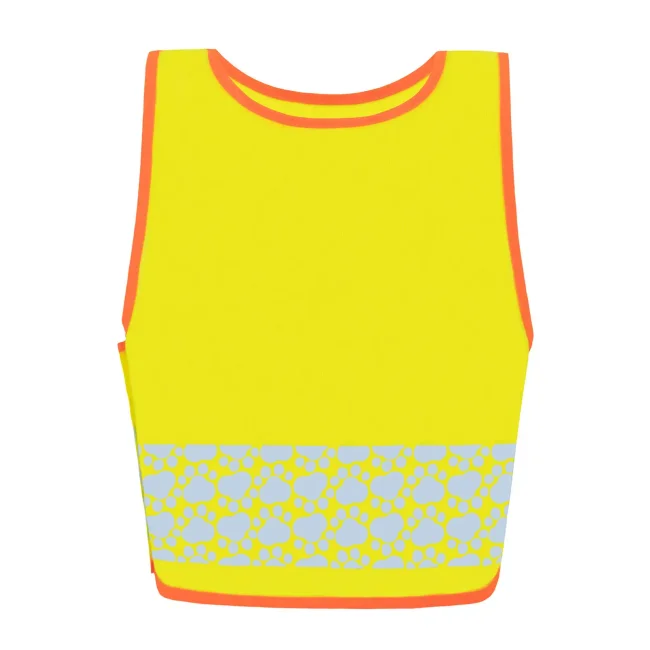 100% poliestere. Gilet ad alta visibilità per bambini con simpatici motivi animali, l'area della pancia degli animali offre una superficie facile da stampare e le strisce riflettenti sono segmentate a forma di tracce di animali, pratica chiusura in velcro sul lato e sulla spalla, tessuto leggero, certificato secondo EN 17353.