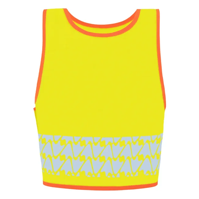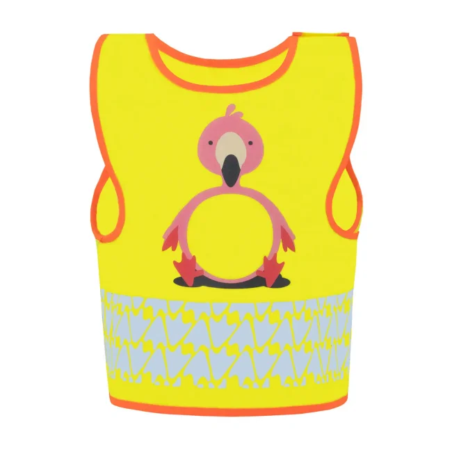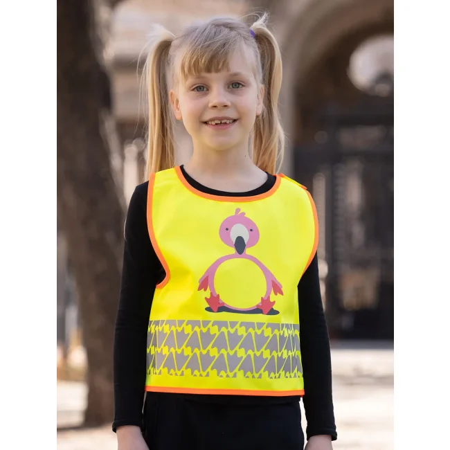 100% poliestere. Gilet ad alta visibilità per bambini con simpatici motivi animali, l'area della pancia degli animali offre una superficie facile da stampare e le strisce riflettenti sono segmentate a forma di tracce di animali, pratica chiusura in velcro sul lato e sulla spalla, tessuto leggero, certificato secondo EN 17353.