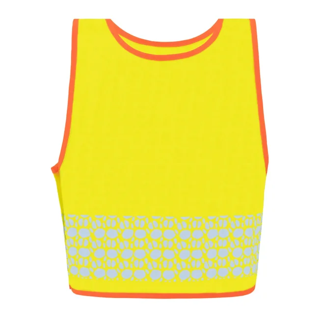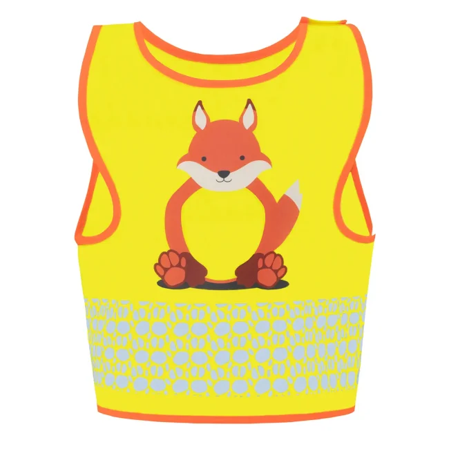 100% poliestere. Gilet ad alta visibilità per bambini con simpatici motivi animali, l'area della pancia degli animali offre una superficie facile da stampare e le strisce riflettenti sono segmentate a forma di tracce di animali, pratica chiusura in velcro sul lato e sulla spalla, tessuto leggero, certificato secondo EN 17353.