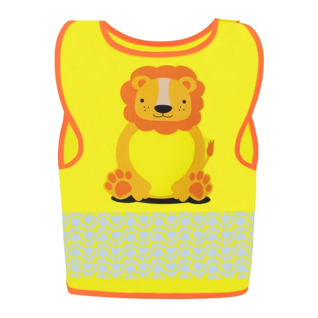 100% poliestere. Gilet ad alta visibilità per bambini con simpatici motivi animali, l'area della pancia degli animali offre una superficie facile da stampare e le strisce riflettenti sono segmentate a forma di tracce di animali, pratica chiusura in velcro sul lato e sulla spalla, tessuto leggero, certificato secondo EN 17353.