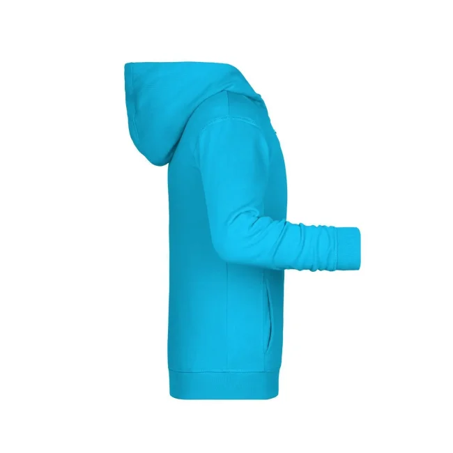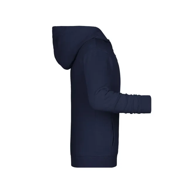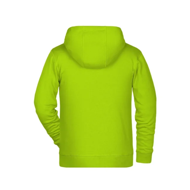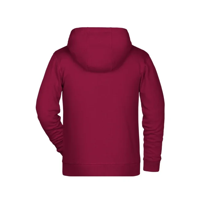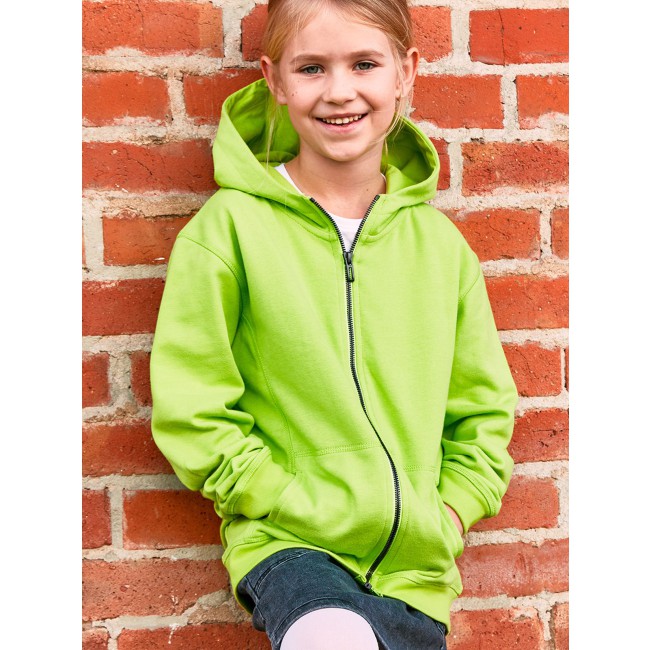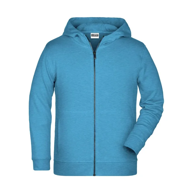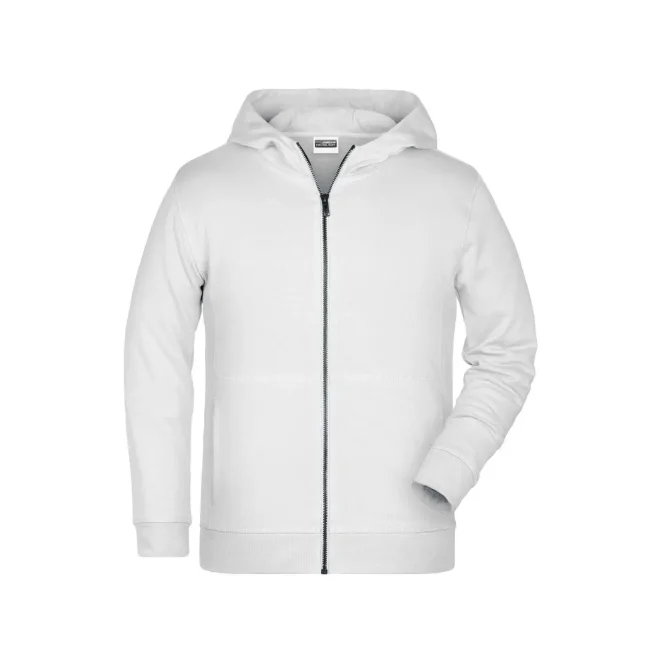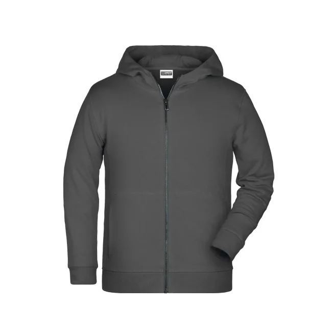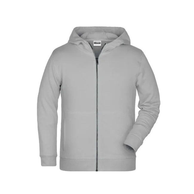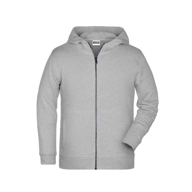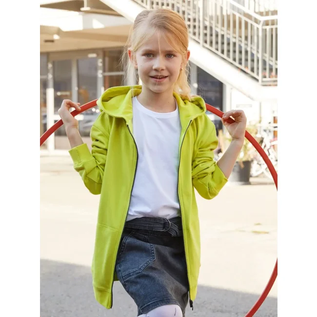 85% cotone organico pettinato ring-spun, 15% poliestere. Felpa da bambino in tessuto di alta qualità, cappuccio a due strati con coulisse, cuciture laterali sul davanti, tasca a canguro, chiusura a zip intera in metallo, etichetta strappabile, French Terry.