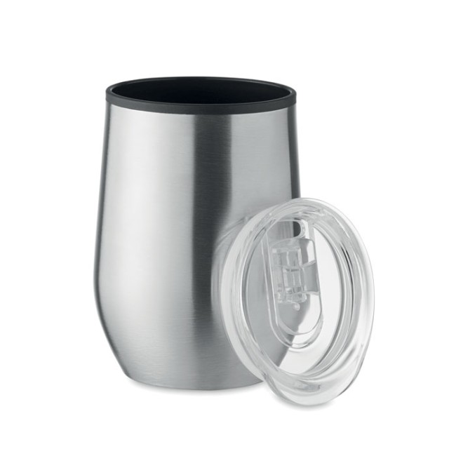 Bicchiere a doppia strato in acciaio inox con interno in PP e coperchio in PS trasparente. Capacità: 350 ml.