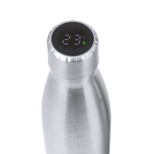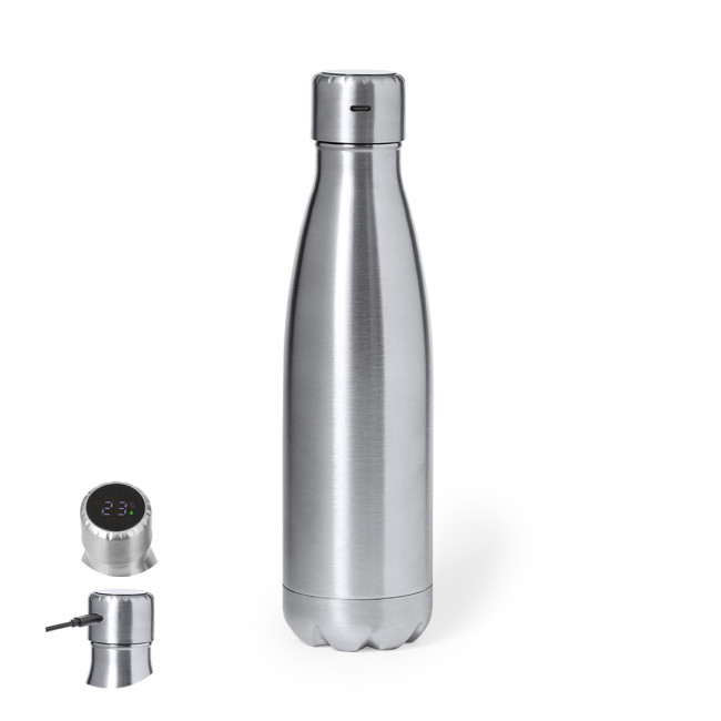 Borraccia termica da 500 ml a doppia parete in acciaio inox con finitura opaca. Con indicatore di temperatura tattile integrato nel tappo e batteria ricaricabile -incluso cavo nero di tipo C-. Con tappo di sicurezza privo di BPA e presentata in un'attraente scatola individuale dal design Kraft e in un sacchetto riciclato. Manuale di istruzioni disponibile in inglese e spagnolo.
