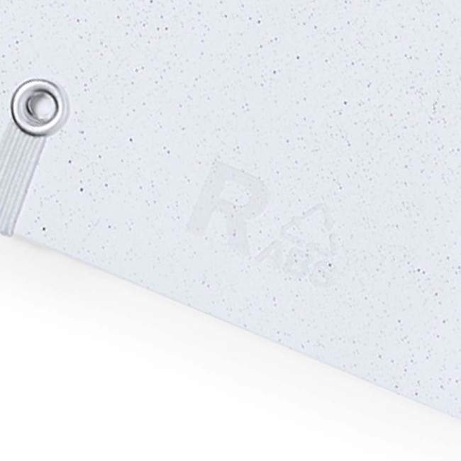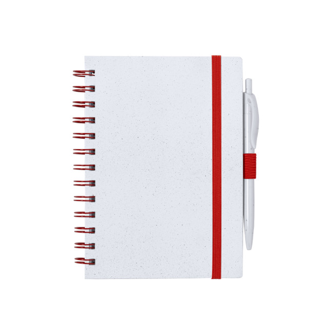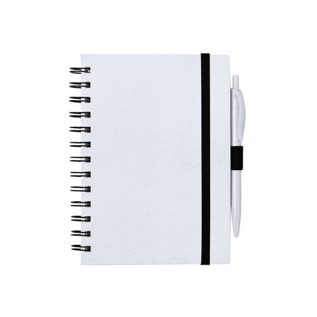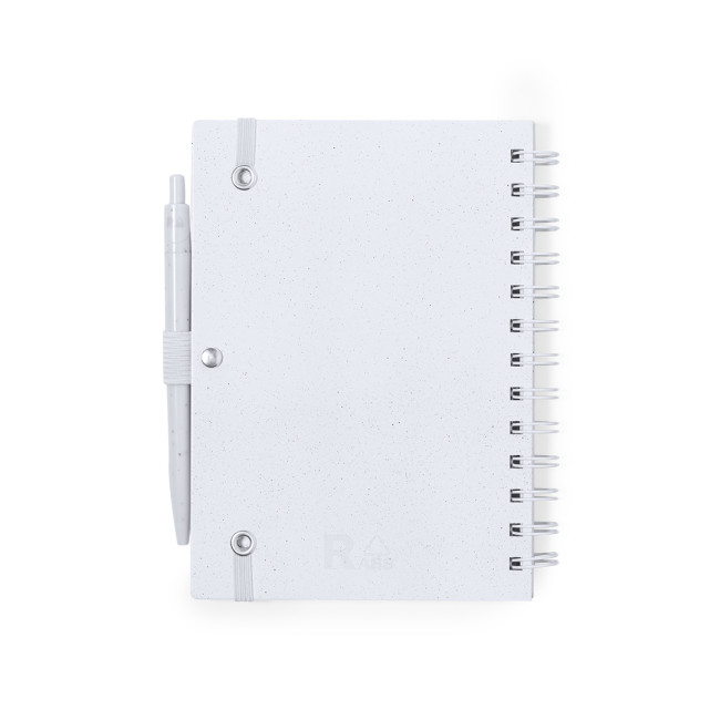 "Set composto da taccuino e penna. Taccuino ad anelli con copertina rigida RABS e penna coordinata. Formato A5, con elegante chiusura elastica disponibile in un'ampia gamma di colori. Interno con 70 fogli bianchi a righe. Penna con meccanismo a pulsante in RABS con inchiostro blu. Incluso logo RABS. Presentato in busta individuale riciclata.