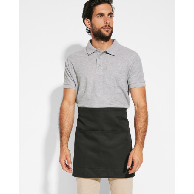 Grembiule corto in twill.· Lacci laterali per un'allacciatura tono su tono.· Due tasche anteriori.· Misure: 71 cm x 43 cm.