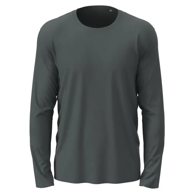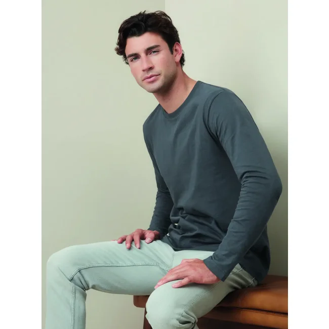 100% cotone ring-spun, single jersey. T-shirt manica lunga set-in, girocollo, struttura con busto tubolare, cucitura a doppio ago su collo, maniche e vita, nastro di rinforzo alle spalle, maniche senza polsini. Col. GYH: 85% cot. 15% vis.