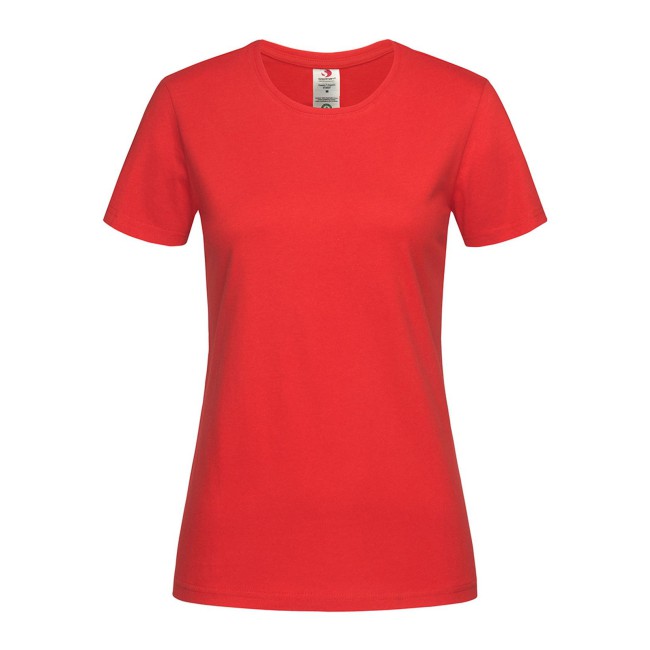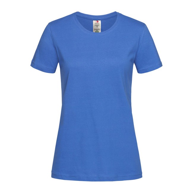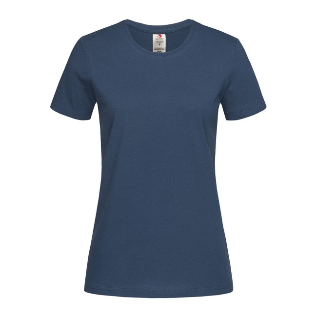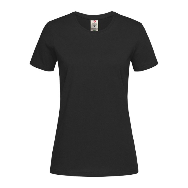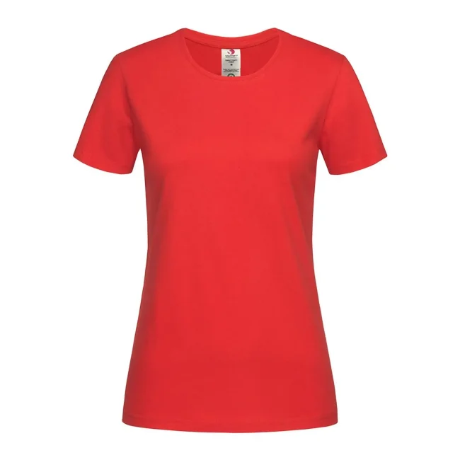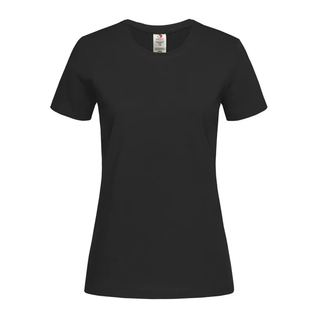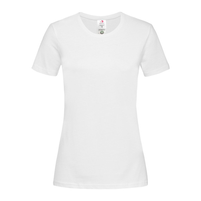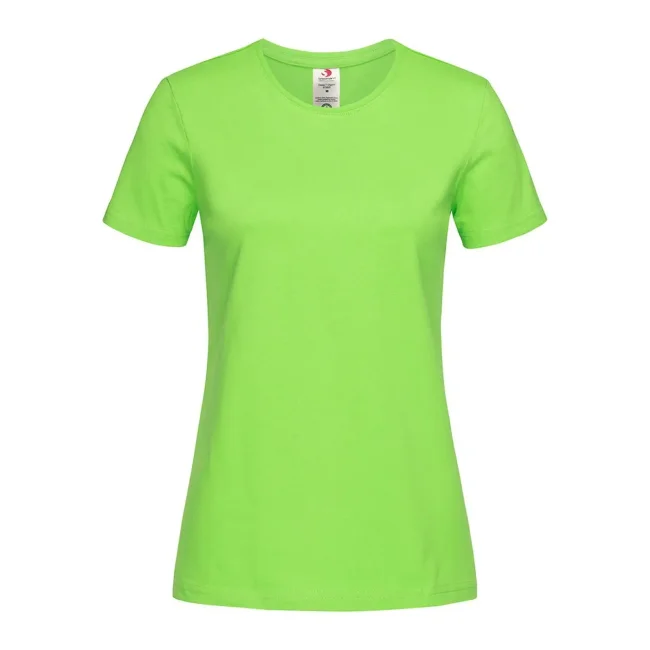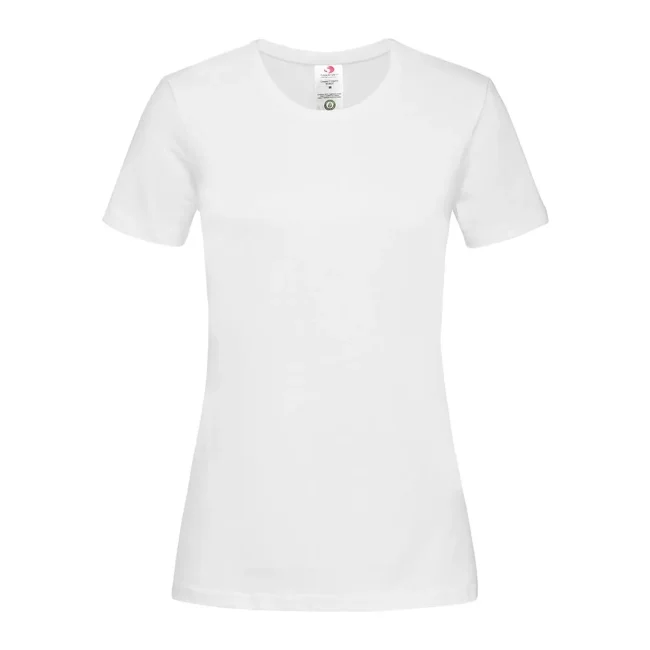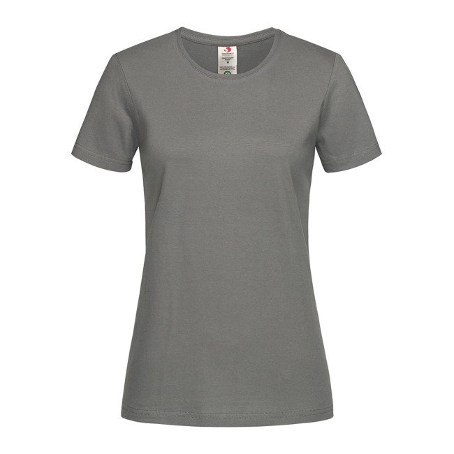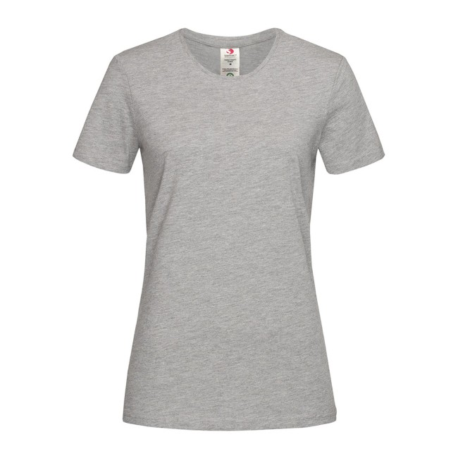 100% cotone certificato organico OCS. T-shirt girocollo da donna con maniche corte, collo in tessuto, cuciture rinforzate sulle spalle, cuciture laterali. Col. GYH 85% cot. 15% visc.