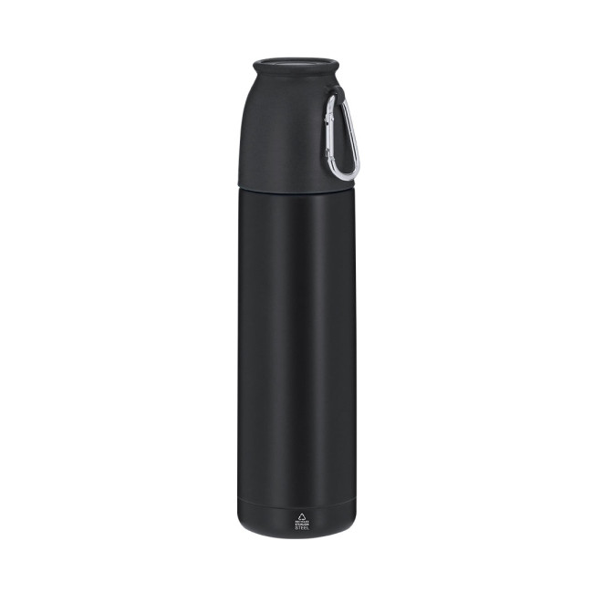 Set di thermos con tazza realizzato in Acciaio Inox Riciclato. Thermos da 500 ml di capacità e a doppia parete, che garantisce una migliore e più duratura conservazione della temperatura, con erogatore di sicurezza. Tazza da 120 ml, regolabile mediante vite e con pratico moschettone per il trasporto. Thermos e tazza in finitura opaca abbinata, ideali per gustare la bevanda, sia calda che fredda, in qualsiasi momento e luogo. Con distintivo di Acciaio Inox Riciclato. L'acciaio è uno dei materiali più richiesti e che può essere trovato quasi ovunque, da prodotti di uso quotidiano a grandi costruzioni. Con innumerevoli proprietà, tra cui la durabilità e l'elevato grado di riutilizzo, lo rende un'alternativa molto apprezzata nelle soluzioni di sostenibilità. Adeguatamente trattato, consente di ottenere nuove risorse di utilizzo infinito.