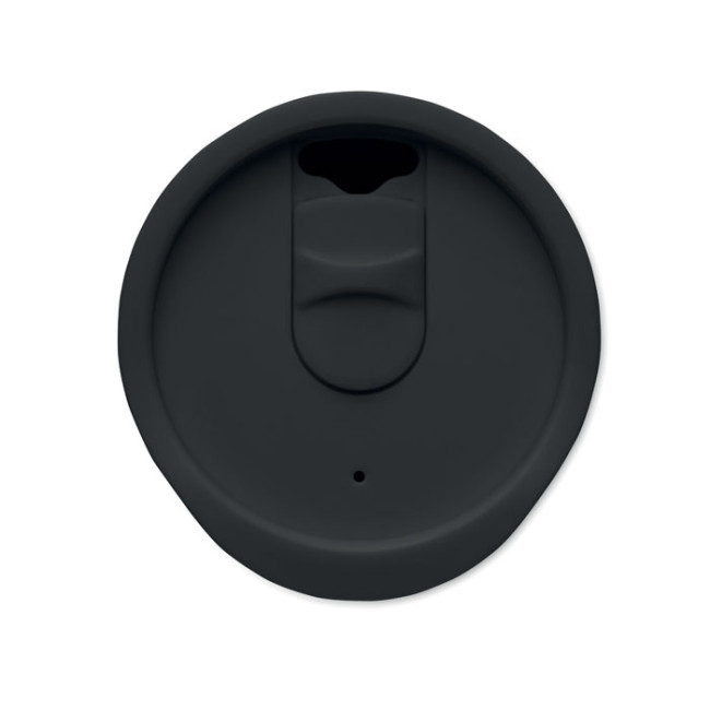 Bicchiere a doppio strato e in PP con base in sughero e coperchio con chiusura a scorrimento in PS. Capacità: 300 ml.