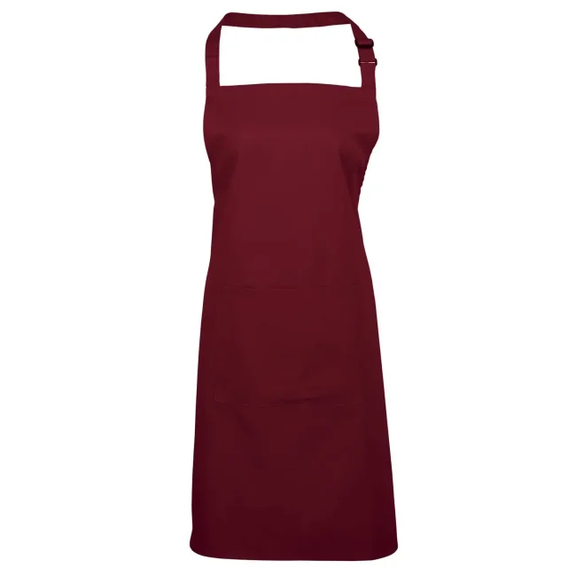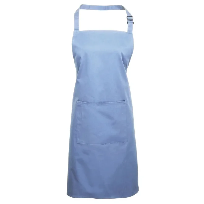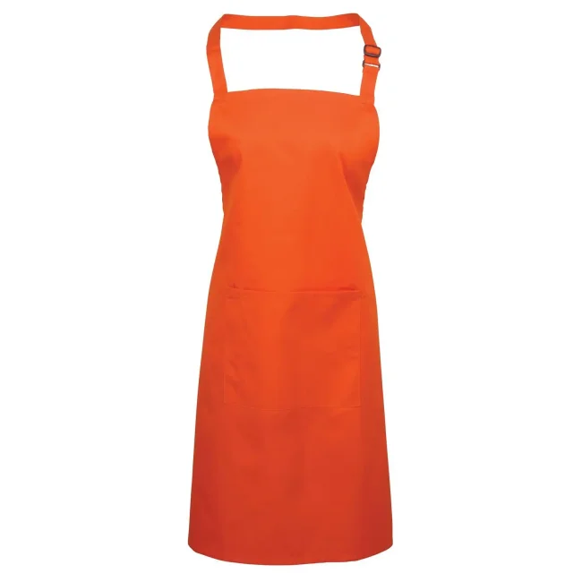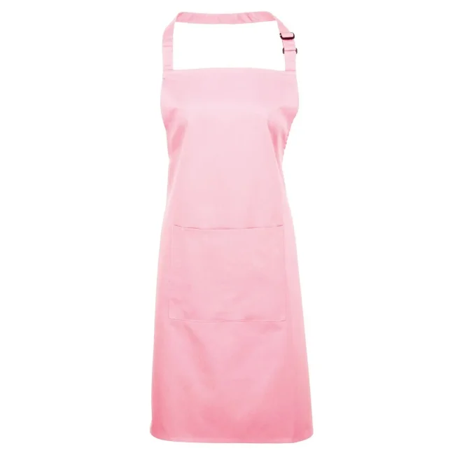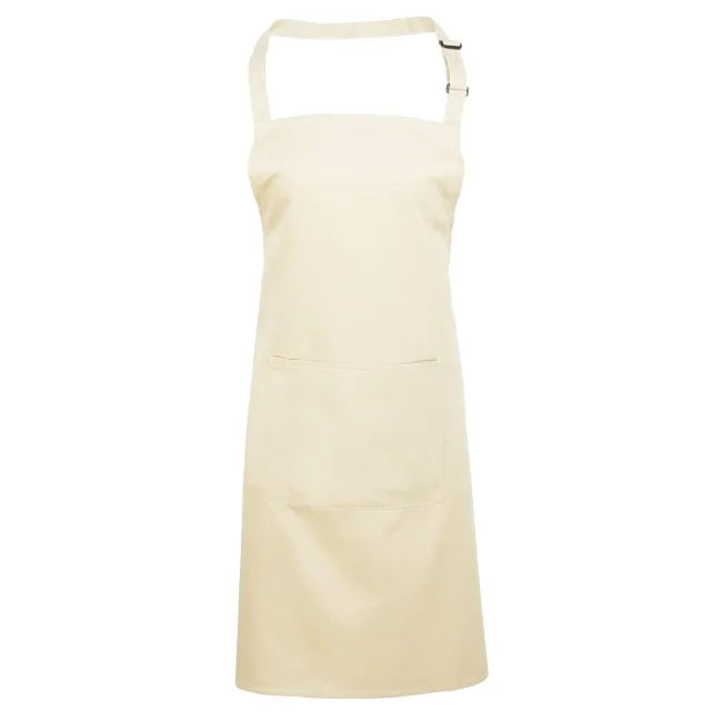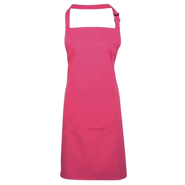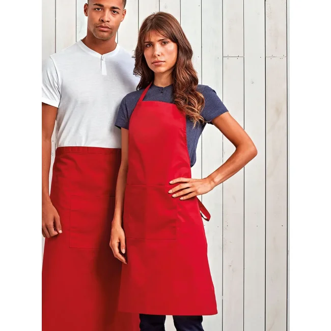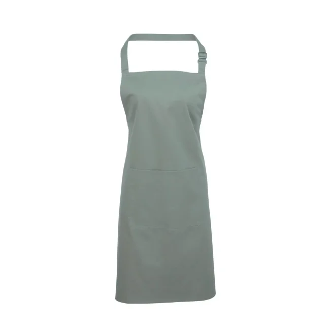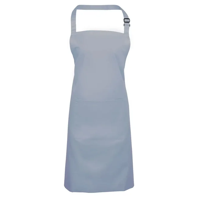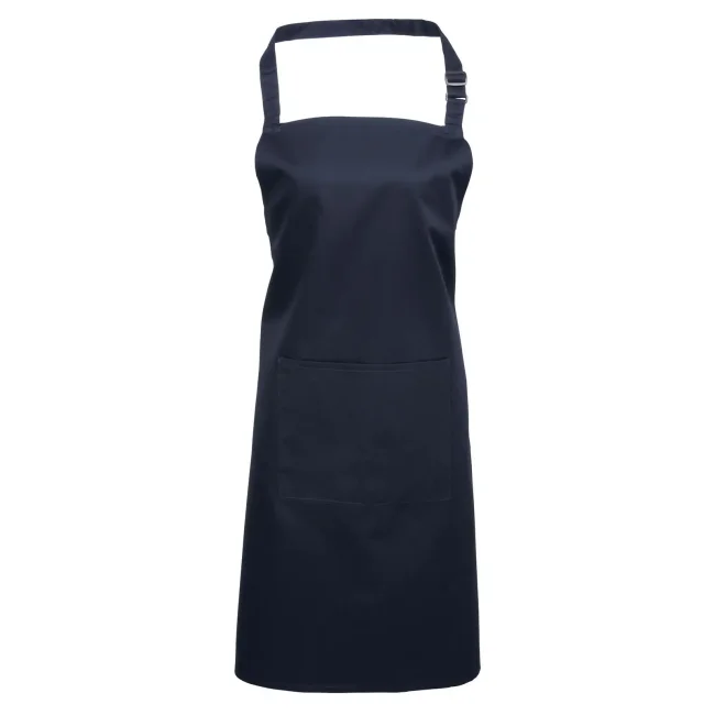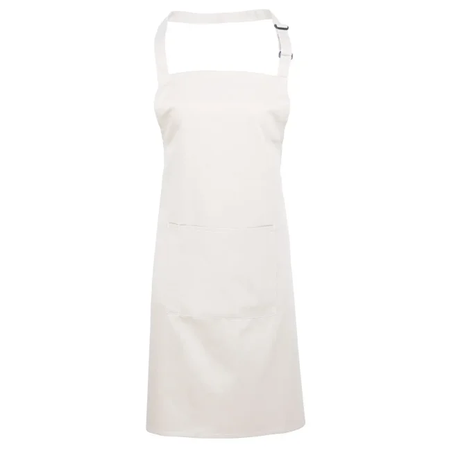 65% poliestere, 35% cotone twill. Grembiule con pettorina, tasca centrale e una tasca per penna separata, laccio al collo regolabile con fibbia. Allacciatura posteriore con lacci di 90 cm. Lavabile a 60°C in lavatrice domestica e 85°C in lavatrice industriale.