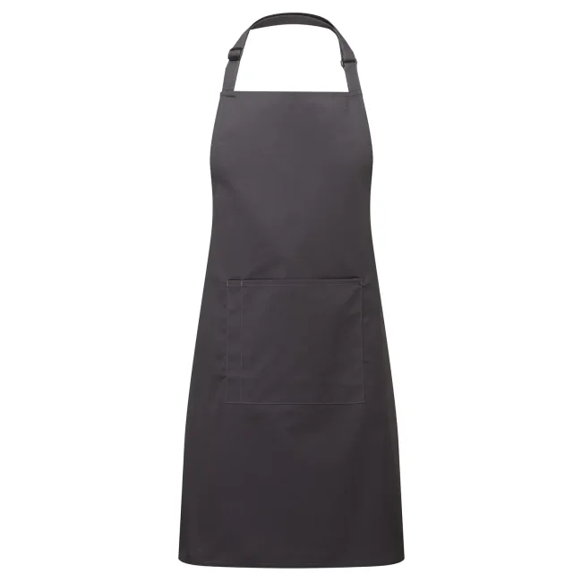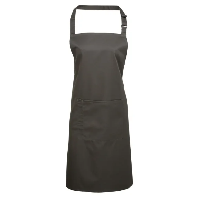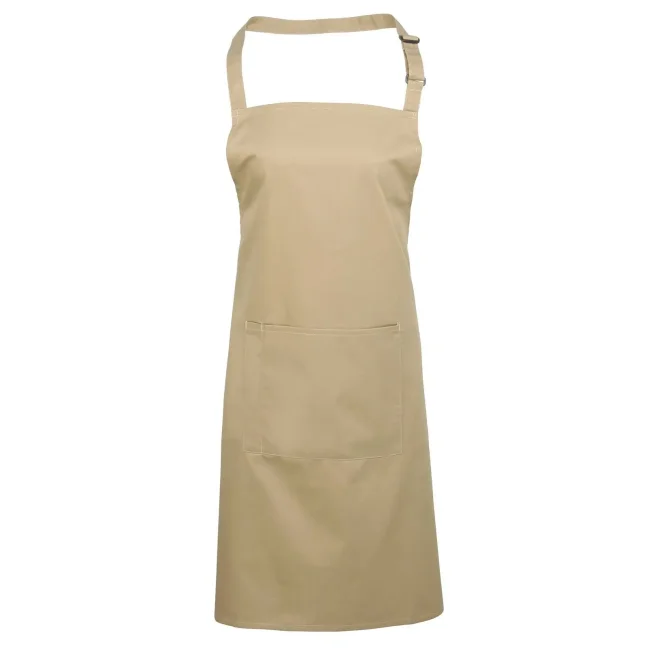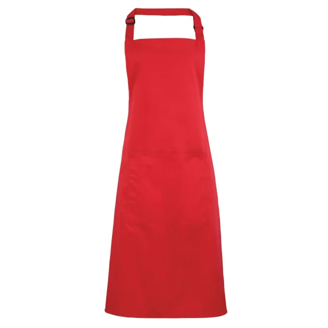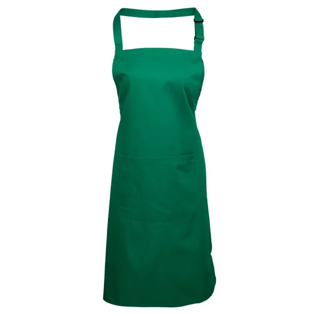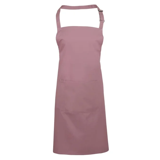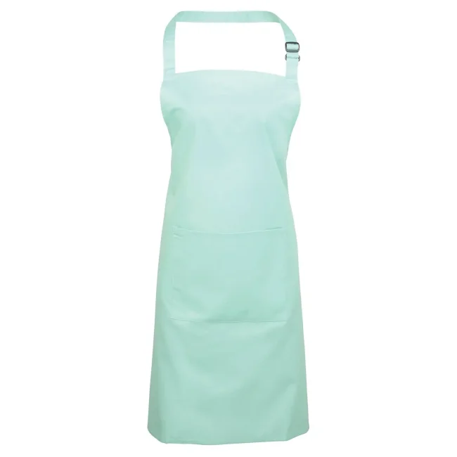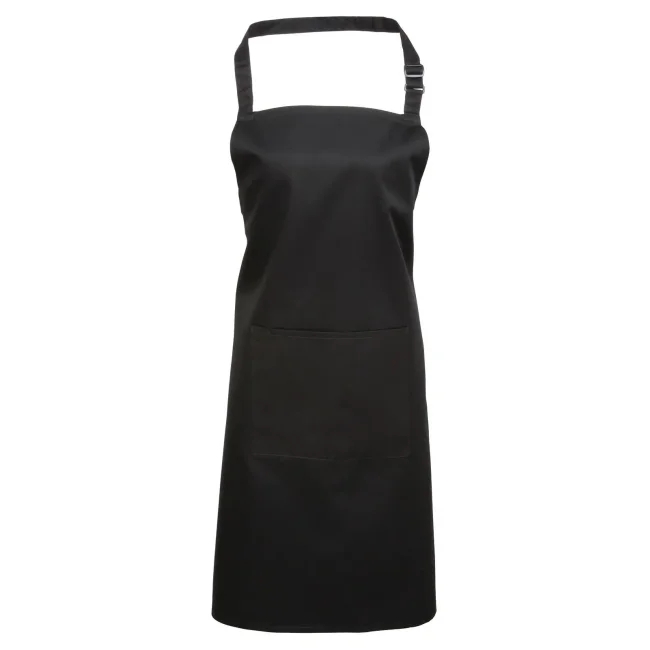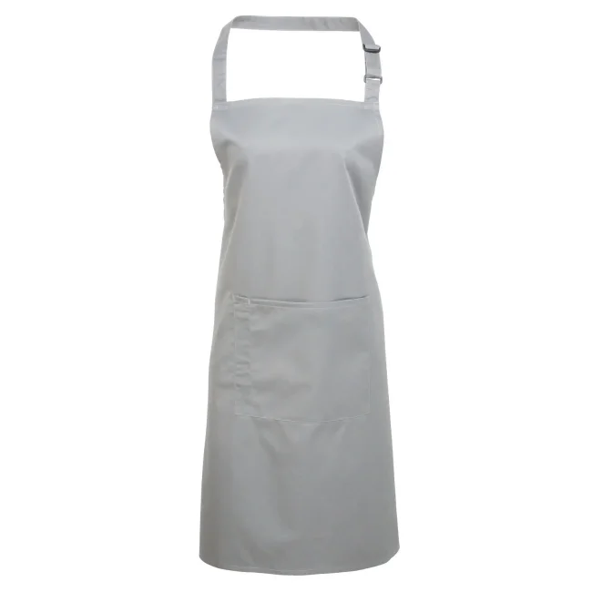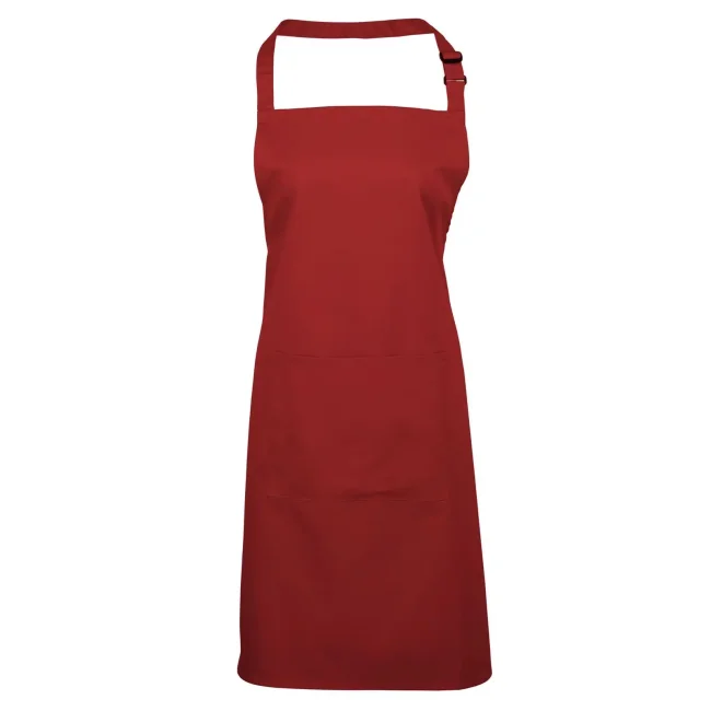 65% poliestere, 35% cotone twill. Grembiule con pettorina, tasca centrale e una tasca per penna separata, laccio al collo regolabile con fibbia. Allacciatura posteriore con lacci di 90 cm. Lavabile a 60°C in lavatrice domestica e 85°C in lavatrice industriale.