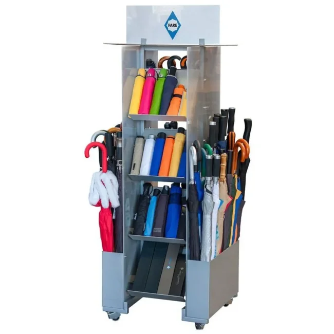 100% acciaio. Espositore per un massimo di 48 ombrelli regolari e circa 48 mini ombrelli, con ruote, otto ripiani, 2 scompartimenti laterali per ombrelli regolari. Larghezza: 60 cm, altezza: 170 cm, profondità: 50 cm.