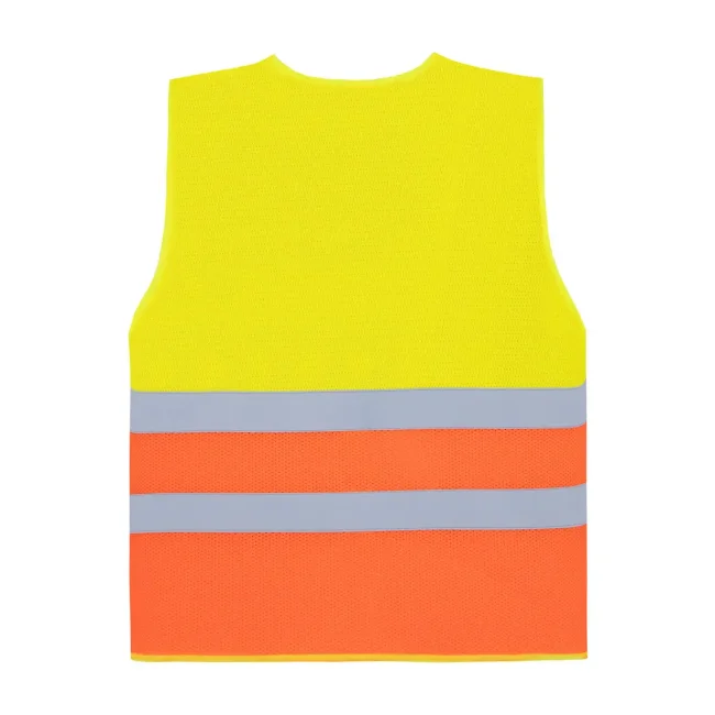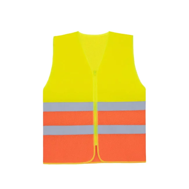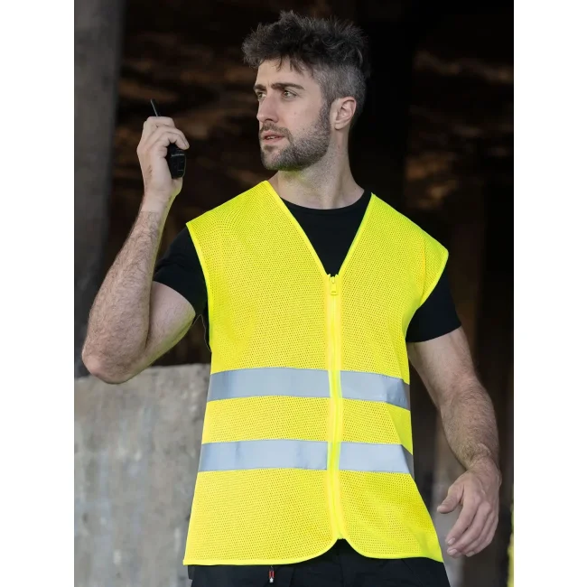100% poliestere. Gilet ad alta visibilità in rete traspirante con taglio comfort , due strisce riflettenti circonferenziali larghe 5 cm, zip frontale, Giallo certificato secondo la norma EN 17353, altri colori certificati secondo la norma EN ISO 20476.