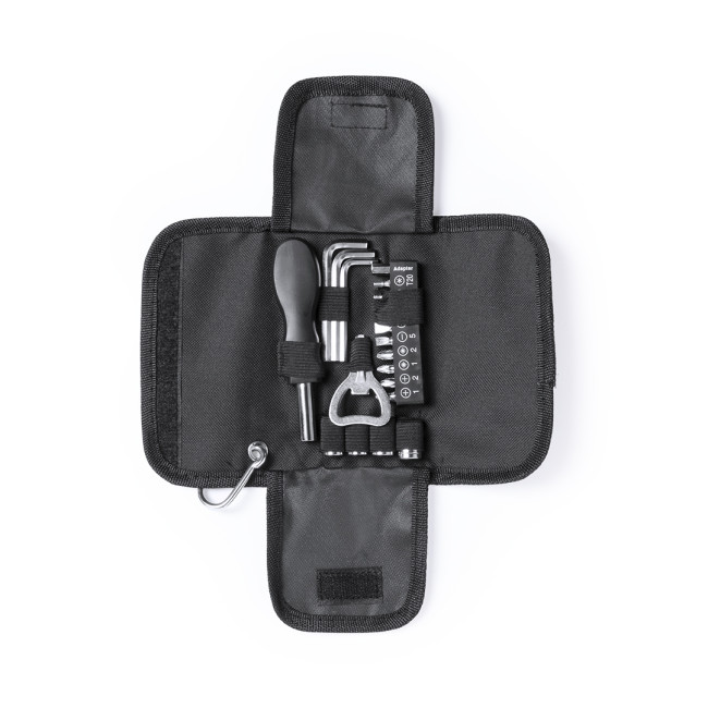 Set di 19 accessori in robusta custodia in poliestere con chiusura a zip. Include pinze, cacciaviti a testa piatta, Phillips e Torx, set di chiavi a brugola, chiavi a bussola esagonali e cavatappi. Con moschettone in metallo per il trasporto.