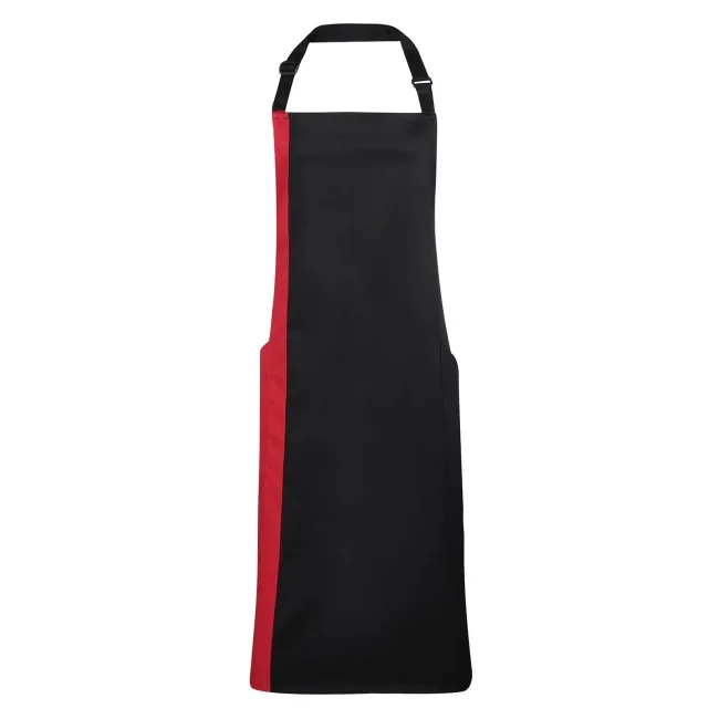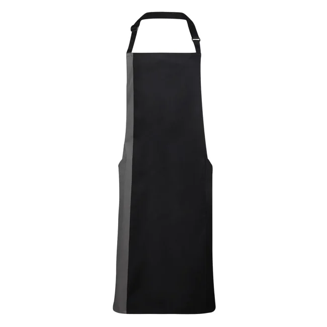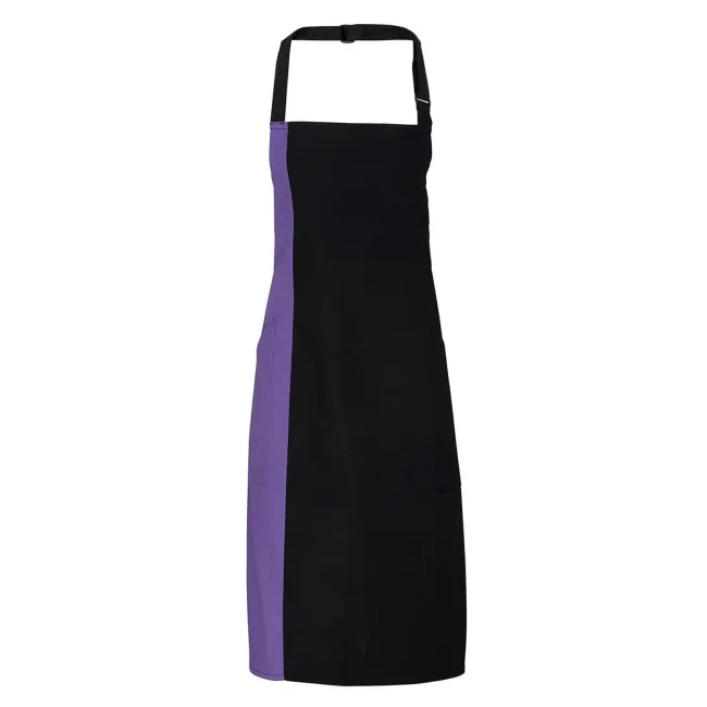 65% poliestere, 35% cotone twill. Grembiule bicolore con pettorina, con fibbia di regolazione al collo, due comode tasche laterali con apertura obliqua, allacciatura posteriore con lacci di 90 cm. Lavabile a 60°C.