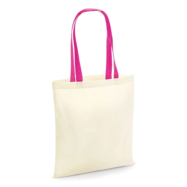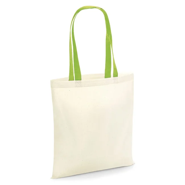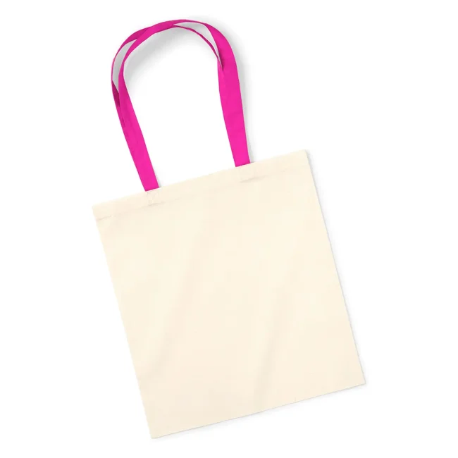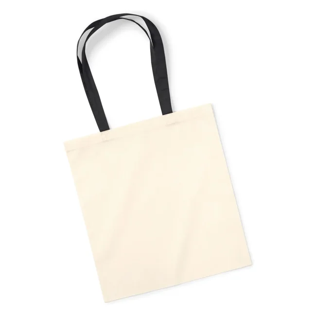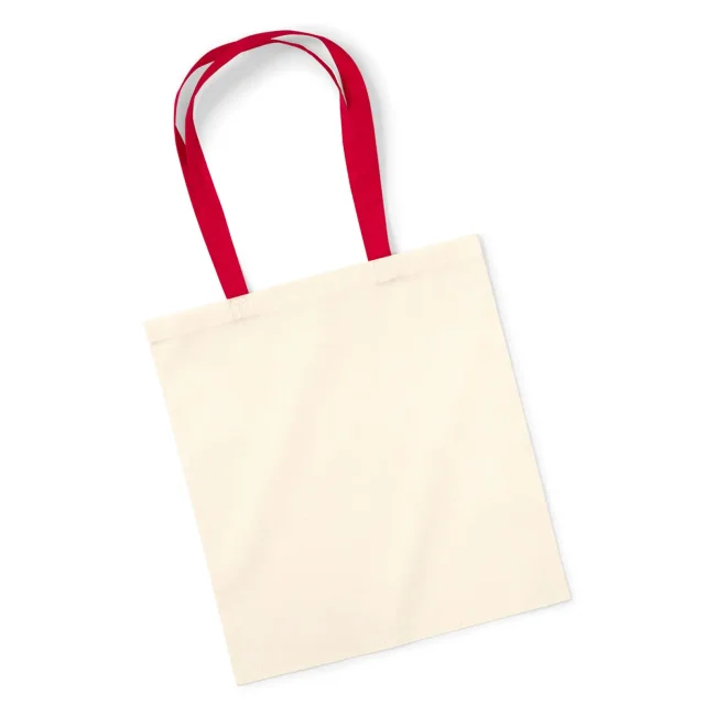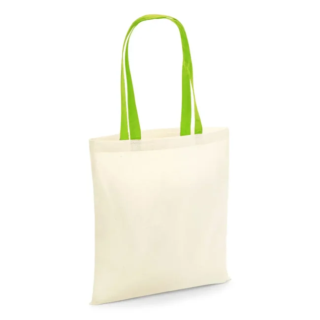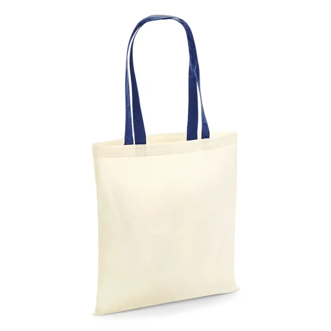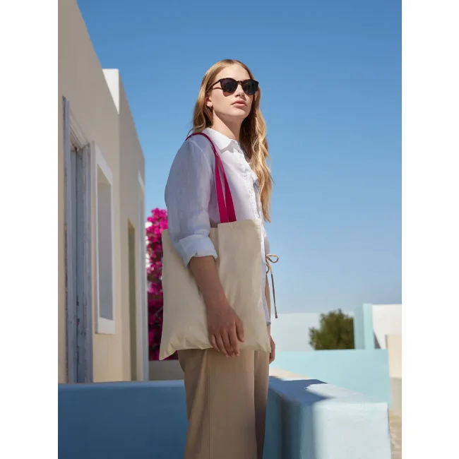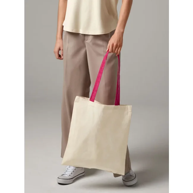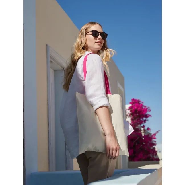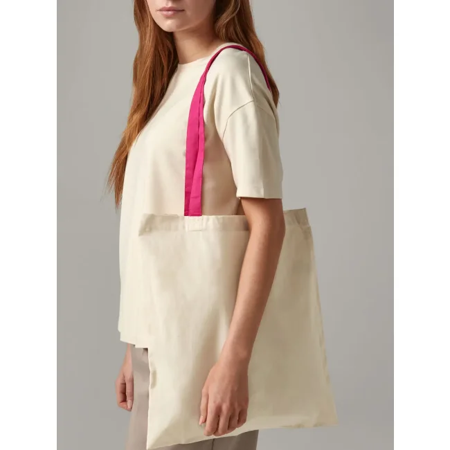 100% cotone. Shopper con manici in contrasto, portabile a mano o sulla spalla. Etichetta removibile. Lunghezza manici: 67 cm, dimensioni: 38x42 cm, capacità: 10 litri, area stampabile: 33x36 cm.