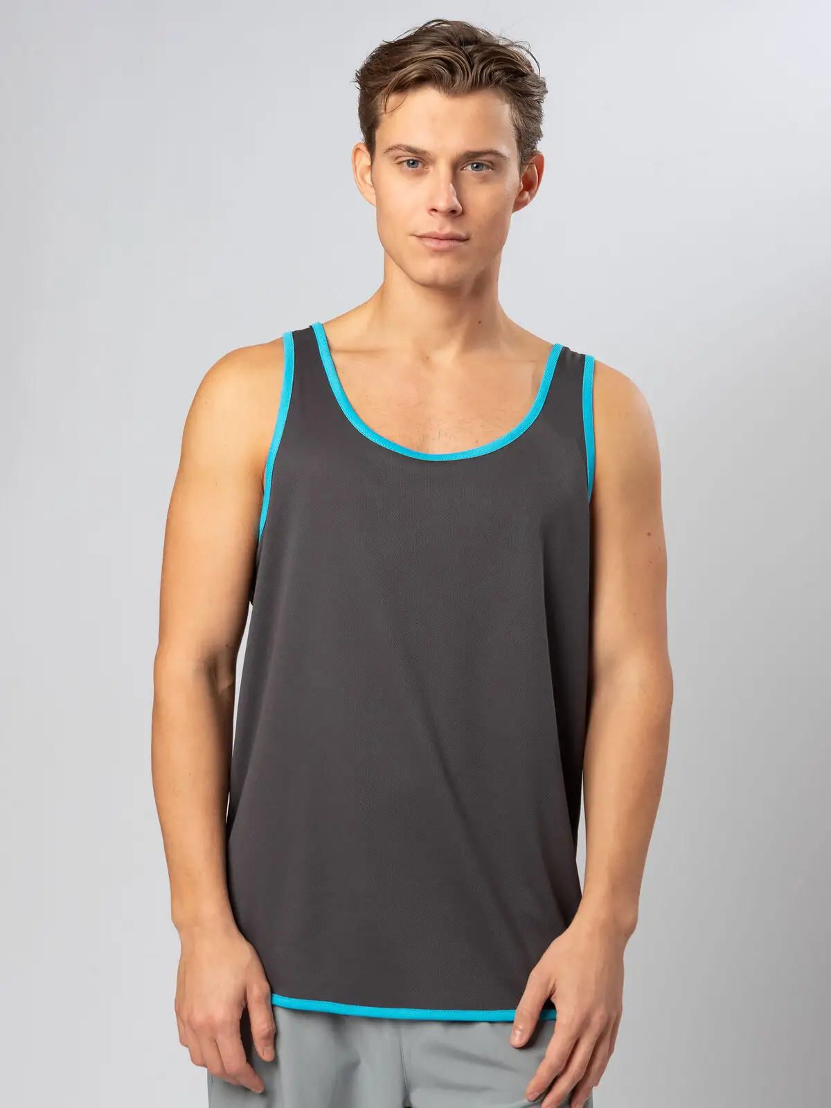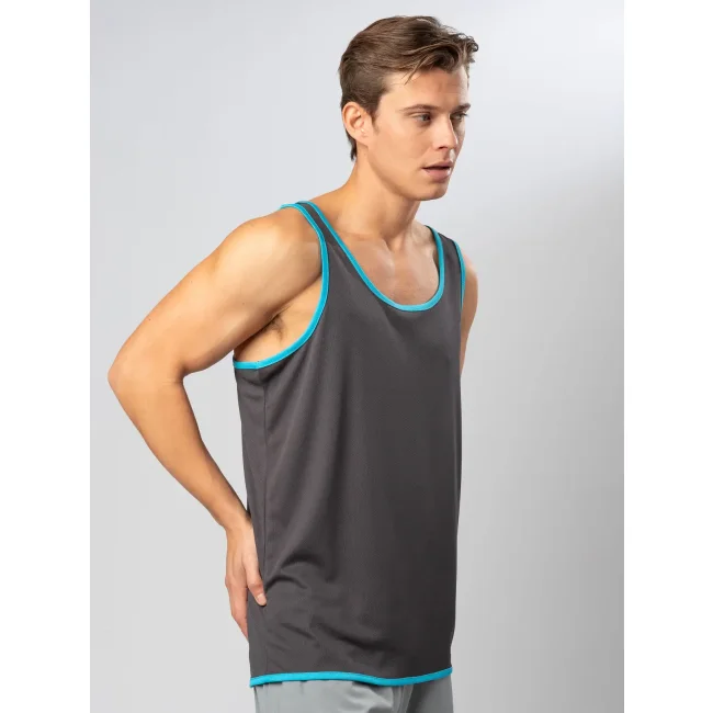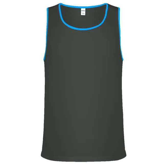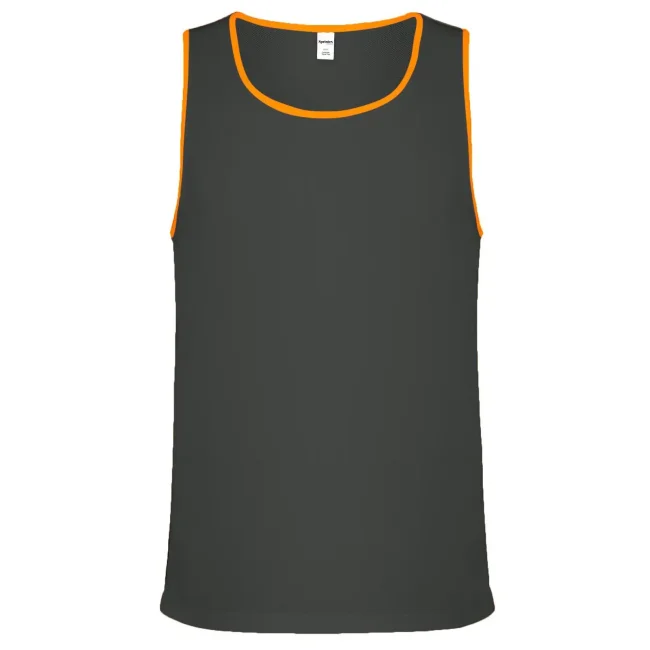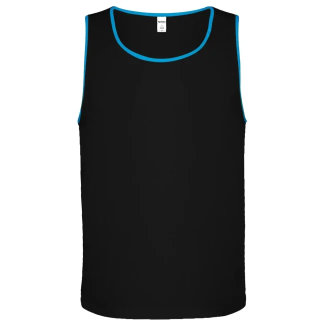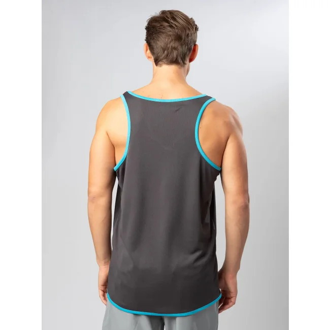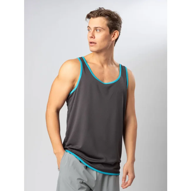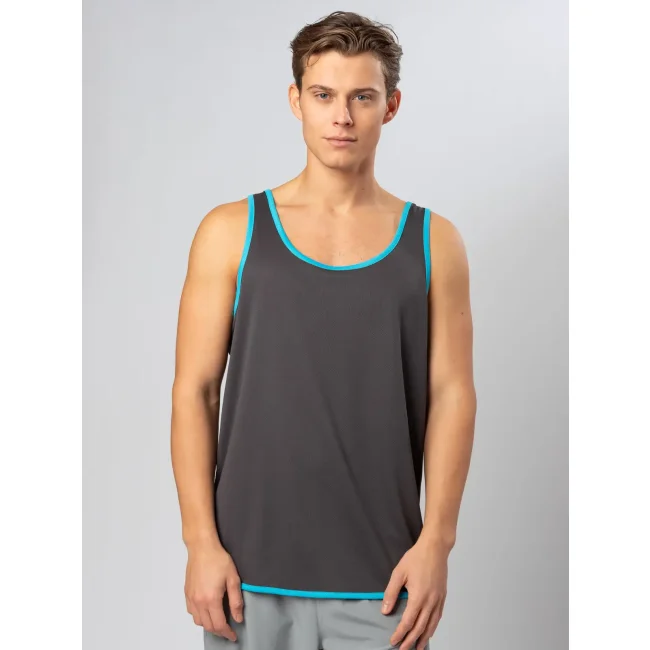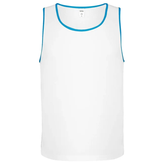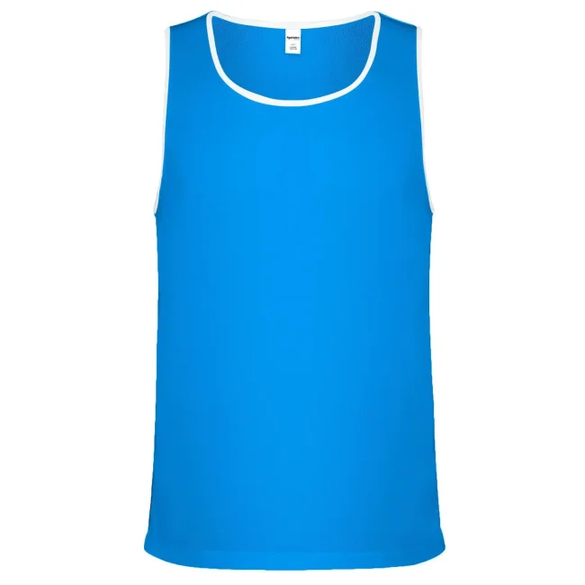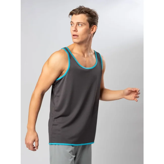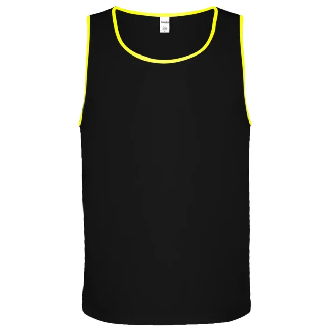 100% poliestere. Canotta sportiva unisex, profondo girocollo, regolazione dell'umidità e asciugatura rapida, orlo su collo, giromanica e orlo inferiore di colore contrastante, struttura con cuciture laterali. Etichetta strappabile.