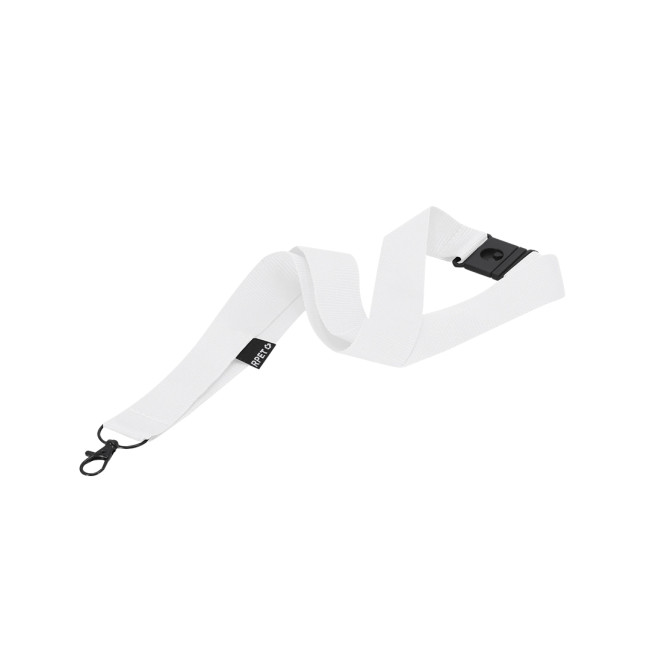 Cordino realizzato in poliestere morbido RPET, dotato di carabichettone rotante in metallo nero e sistema di blocco di sicurezza. Include l'etichetta distintiva RPET, rendendolo un accessorio pratico e sostenibile.