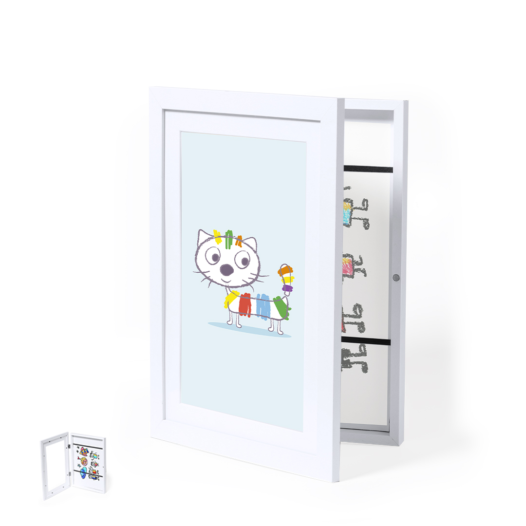 Cornice artistica elegante che unisce funzionalità e stile. Offre uno scomparto per riporre disegni in formato A4, tenuti in posizione da elastici, mentre il coperchio incorpora una cornice per evidenziare il disegno scelto. L'apertura a cerniera e la chiusura magnetica garantiscono una gestione pratica e sicura. Presentata singolarmente in una scatola kraft di design, rappresenta una soluzione versatile per artisti e creativi.