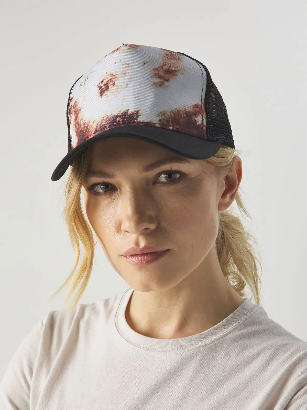 100% poliestere. Cappellino a 5 pannelli, mesh posteriore e laterale, pannello frontale stampato all-over, visiera pre-curvata, chiusura in pvc, 6 cuciture su visiera. Etichetta strappabile.