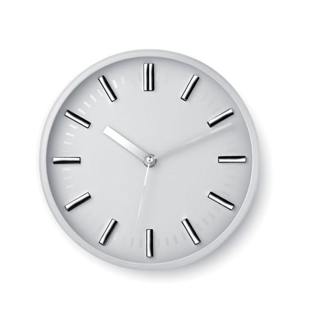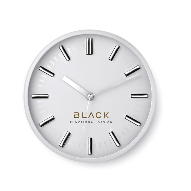 Orologio analogico da parete con sistema 'clic clac' per facilitare la rimozione del quadrante ed eseguire la stampa. In PS e vetro. 1 batteria AA non inclusa.