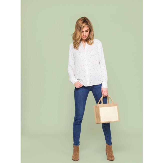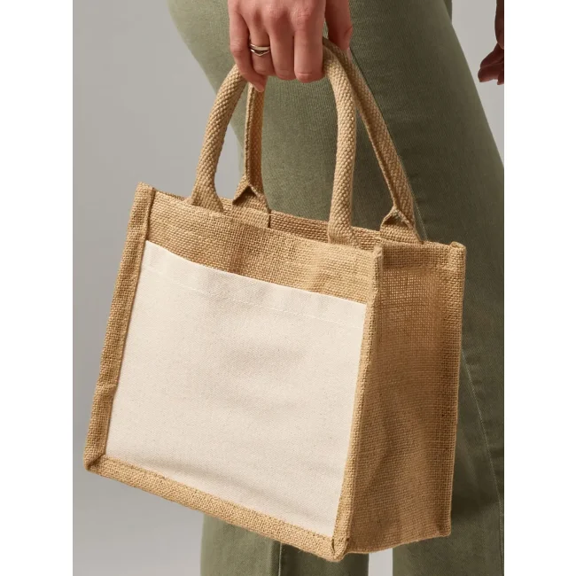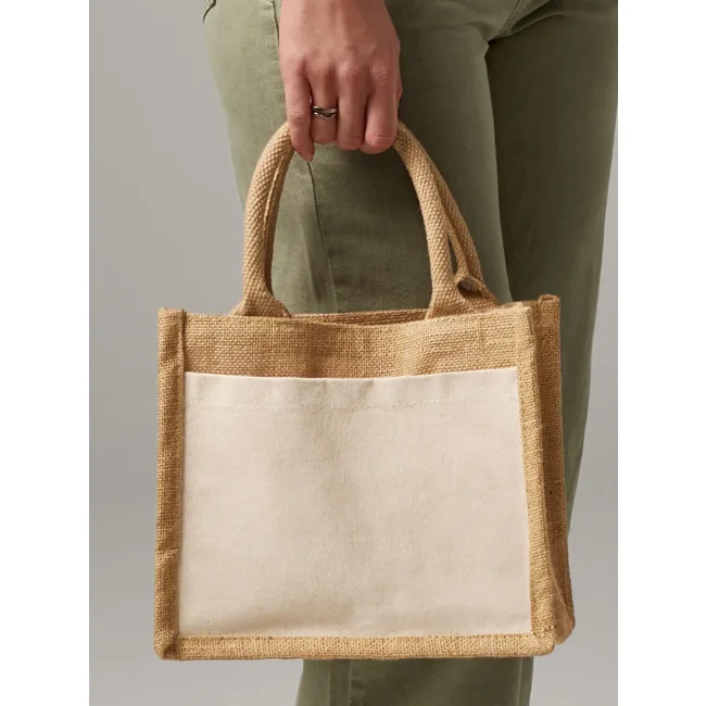 100% juta laminata. Shopper multiuso in juta laminata con tasca frontale in 100% cotone. Etichetta removibile. Lunghezza manici: 35 cm. Dimensioni: 26 x 22 x 14 cm, capacita': 6 litri, area stampabile: 21 x 13 cm. Removable label.